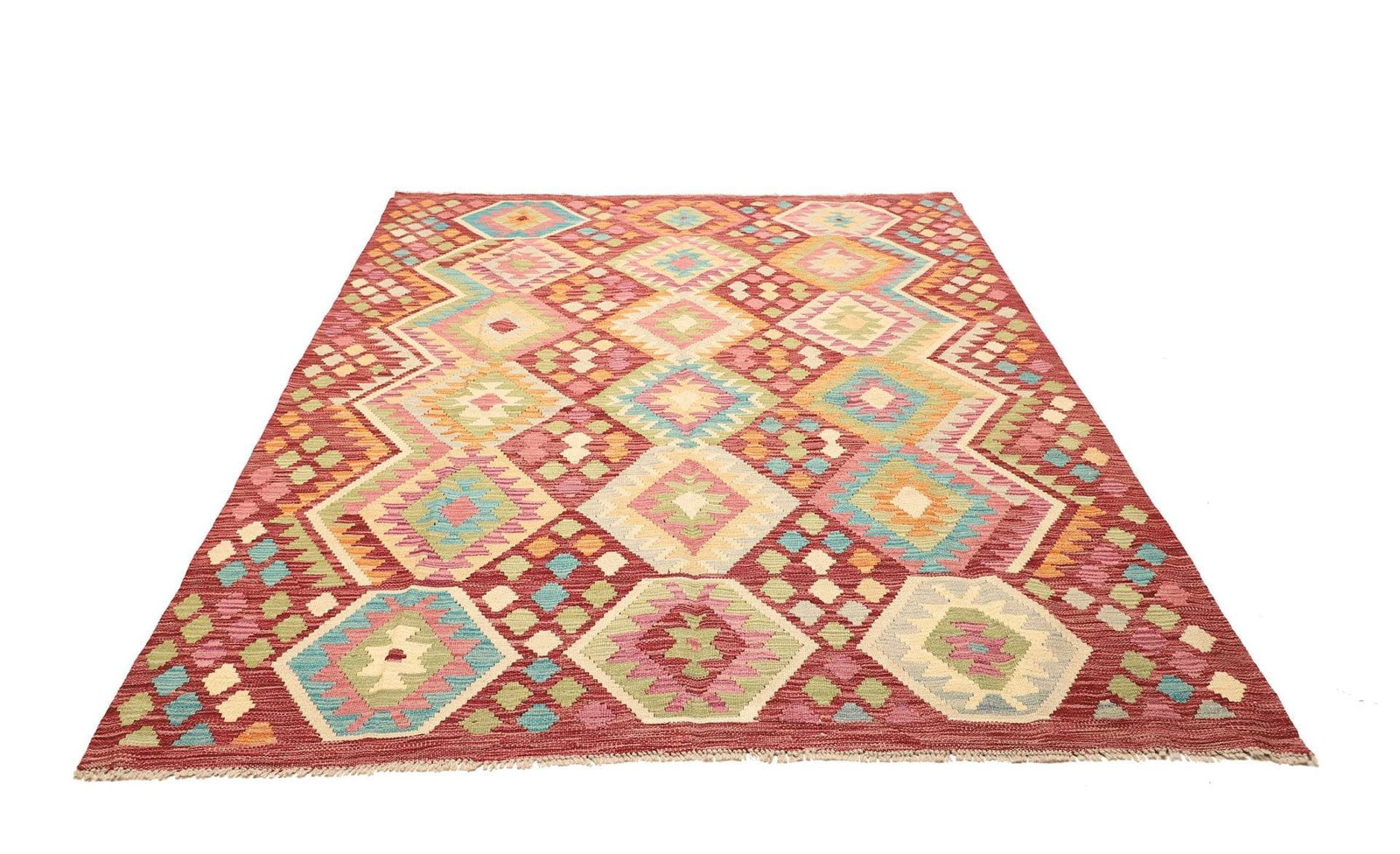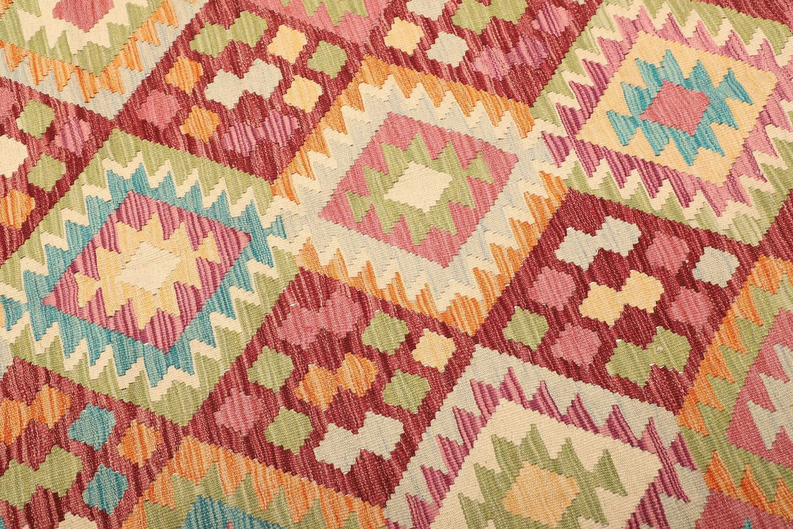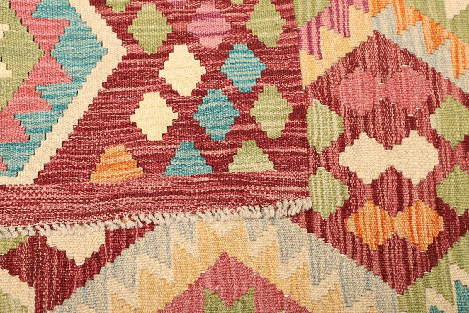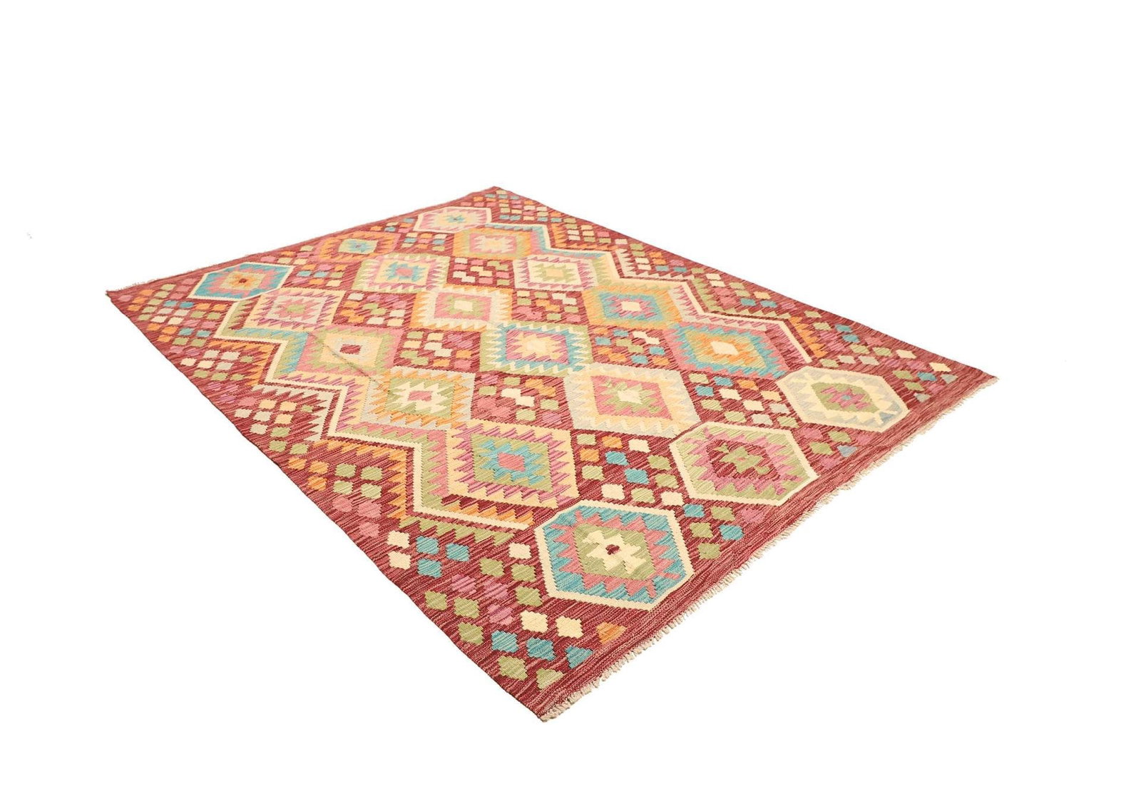 Handgewebter Kelim | Herkunft: Pakistan | Knotendichte: ca. 200.000 Knoten/m² | Flor: 100% Schurwolle | Kette: 100% Baumwolle | Größe: 186×235 cm | Höhe: ca. 5 mm | Rustikales Flair, ideal für moderne Einrichtungsstile