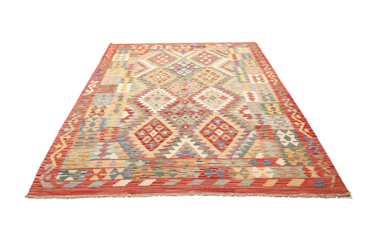Kelim Teppich | Knotendichte: ca. 200.000 Knoten/m² | Material: 100% Schurwolle und 100% Baumwolle | Größe: 186×243 cm | In ausgezeichnetem Zustand | Herkunft: Pakistan | Handgewebte Qualität | Rustikales Flair, ideal für moderne Einrichtungsstile