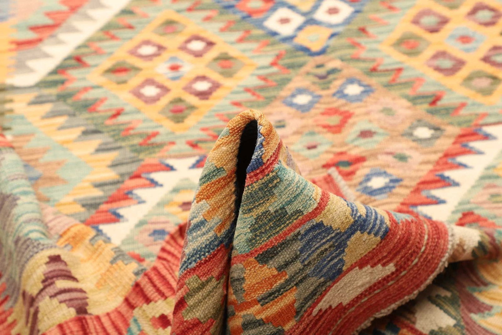 Der Kelim Teppich wird aus 100 % hochwertiger Schurwolle gefertigt. Schurwolle ist bekannt für ihre Robustheit, Langlebigkeit und hervorragenden isolierenden Eigenschaften. Die Verwendung von Schurwolle sorgt dafür, dass der Teppich eine angenehme Haptik besitzt und gleichzeitig warm und einladend wirkt. Der Teppich ist handgewebt, was bedeutet, dass jedes Stück ein Unikat ist, das durch die Hingabe und das Geschick des erfahrenen Kunsthandwerkers entstanden ist. Die sorgfältige Verarbeitung garantiert nicht nur eine hohe Qualität, sondern auch eine beeindruckende Knotendichte, die dem Teppich Stabilität und Haltbarkeit verleiht.