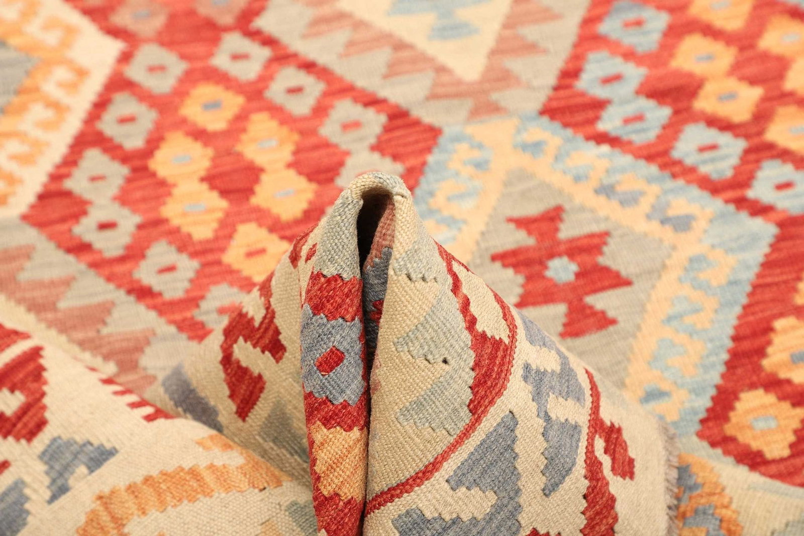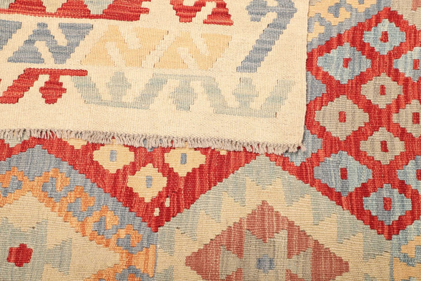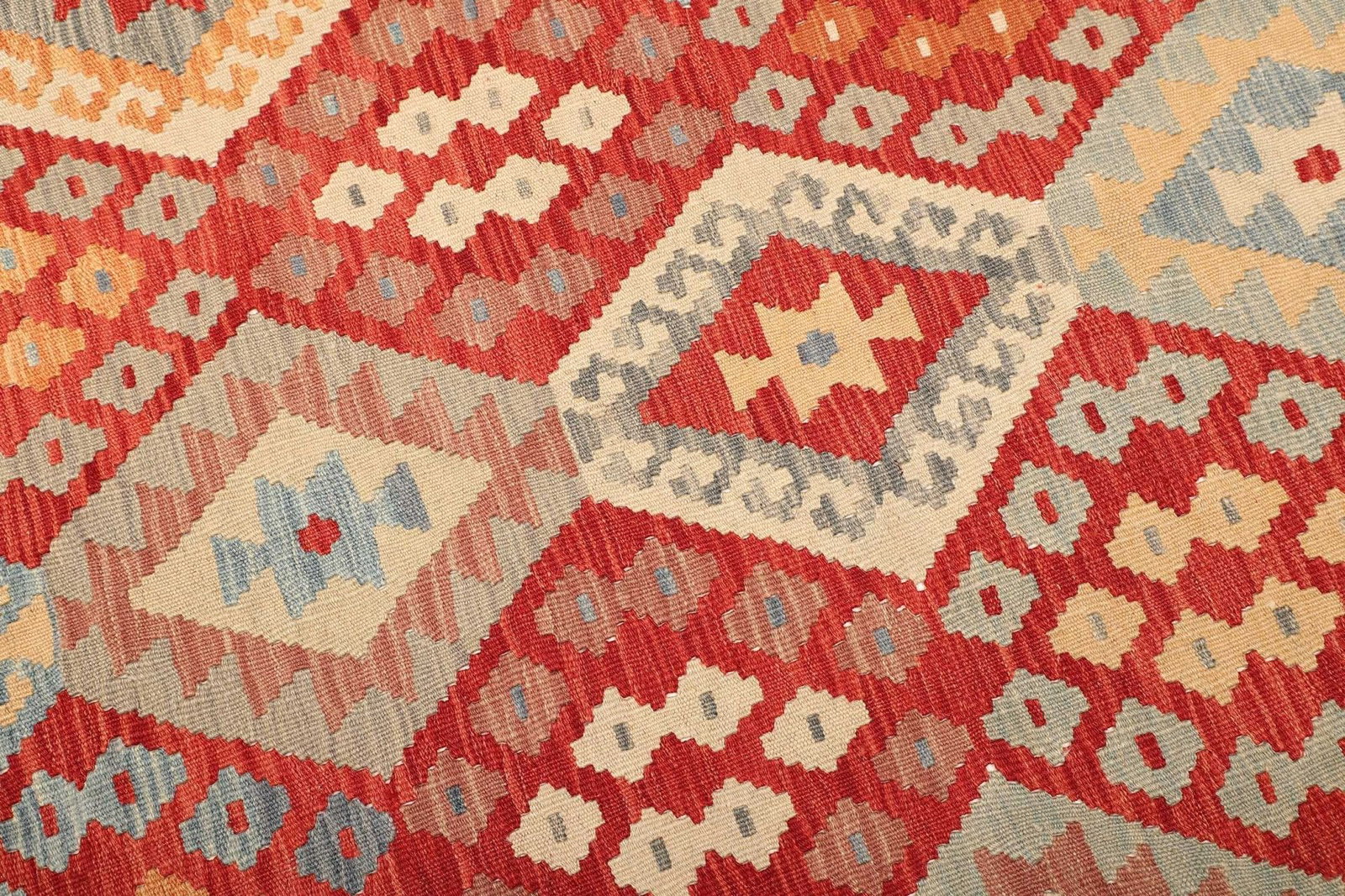 Der Kelim Teppich ist aus hochwertiger Schurwolle gefertigt. Schurwolle ist bekannt für ihre Strapazierfähigkeit, ihre natürliche Mottenschutzfunktion und ihre hervorragenden schalldämmenden Eigenschaften. Die Verwendung von Schurwolle sorgt dafür, dass der Teppich auch bei intensiver Nutzung seine Form und Farbe behält. Die handgewebte Technik unterstreicht die Qualität und die Liebe zum Detail, die in jedes Stück gesteckt wurde. Im Gegensatz zu maschinell hergestellten Teppichen haben handgewebte Exemplar eine deutlich höhere Knotendichte, was zu einer längeren Lebensdauer und einer höheren Robustheit führt.