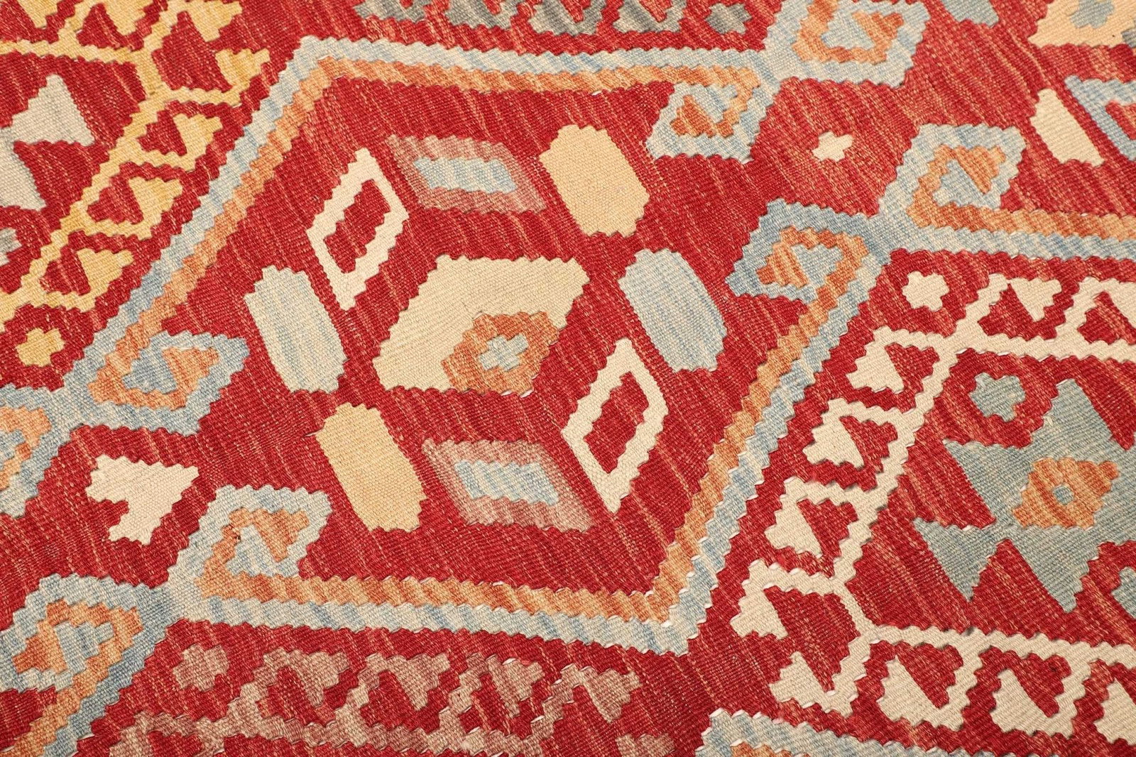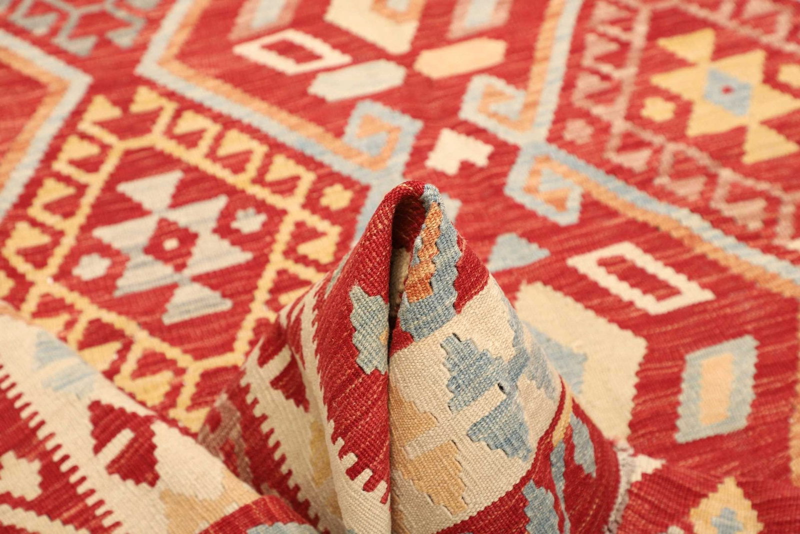 Der Kelim Teppich besteht aus reiner Wolle, die nicht nur den Vorteil einer hohen Strapazierfähigkeit mit sich bringt, sondern auch für eine hervorragende Isolierung sorgt. Wolle ist atmungsaktiv und kann bis zu 30% ihres Eigengewichts an Feuchtigkeit aufnehmen, ohne sich dabei feucht anzufühlen. Die handgewebte Technik stellt sicher, dass jeder Teppich ein Unikat ist, in dem sich das Können und die Kreativität der Weber widerspiegeln. Mit einer sorgfältig eingearbeiteten Knotendichte wird nicht nur eine hohe Qualität garantiert, sondern auch eine ansprechende Struktur, die den Teppich besonders strapazierfähig macht.