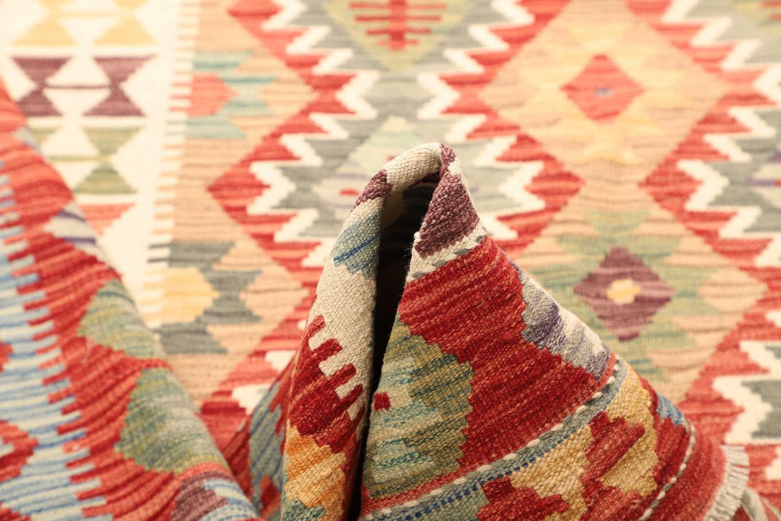 Ein weiterer Vorteil des Kelim Teppichs ist, dass er hypoallergen ist und keine gesundheitsschädlichen Stoffe wie chemische Rückstände enthält, die oft in industriell gefertigten Teppichen zu finden sind. So sorgt er für eine gesündere und angenehmere Wohnatmosphäre.