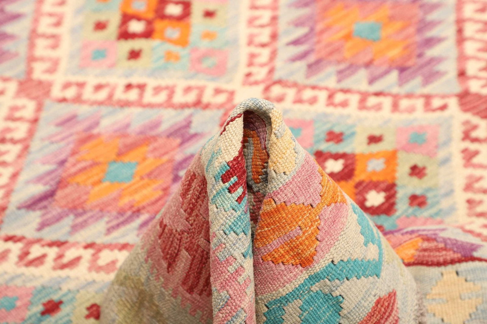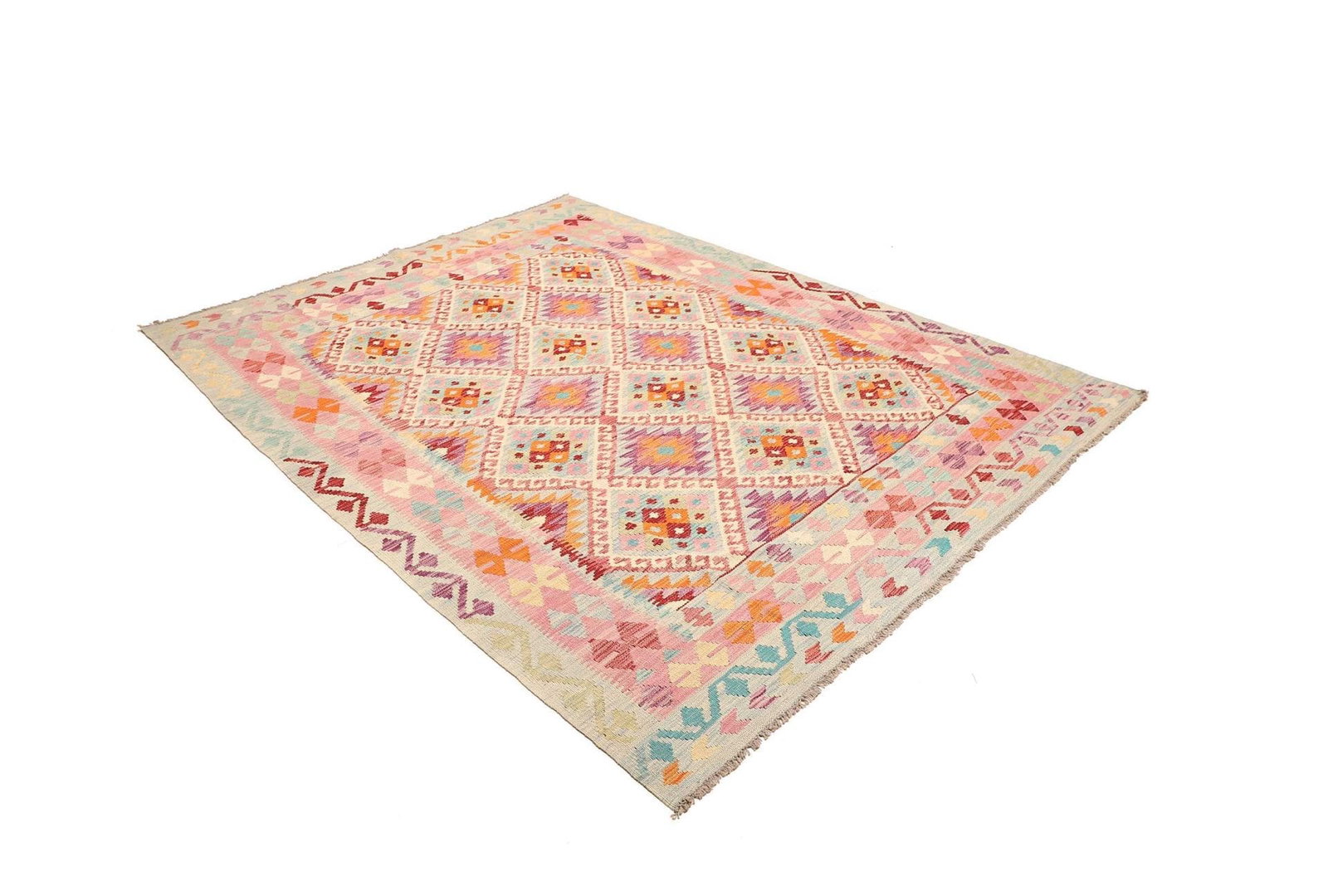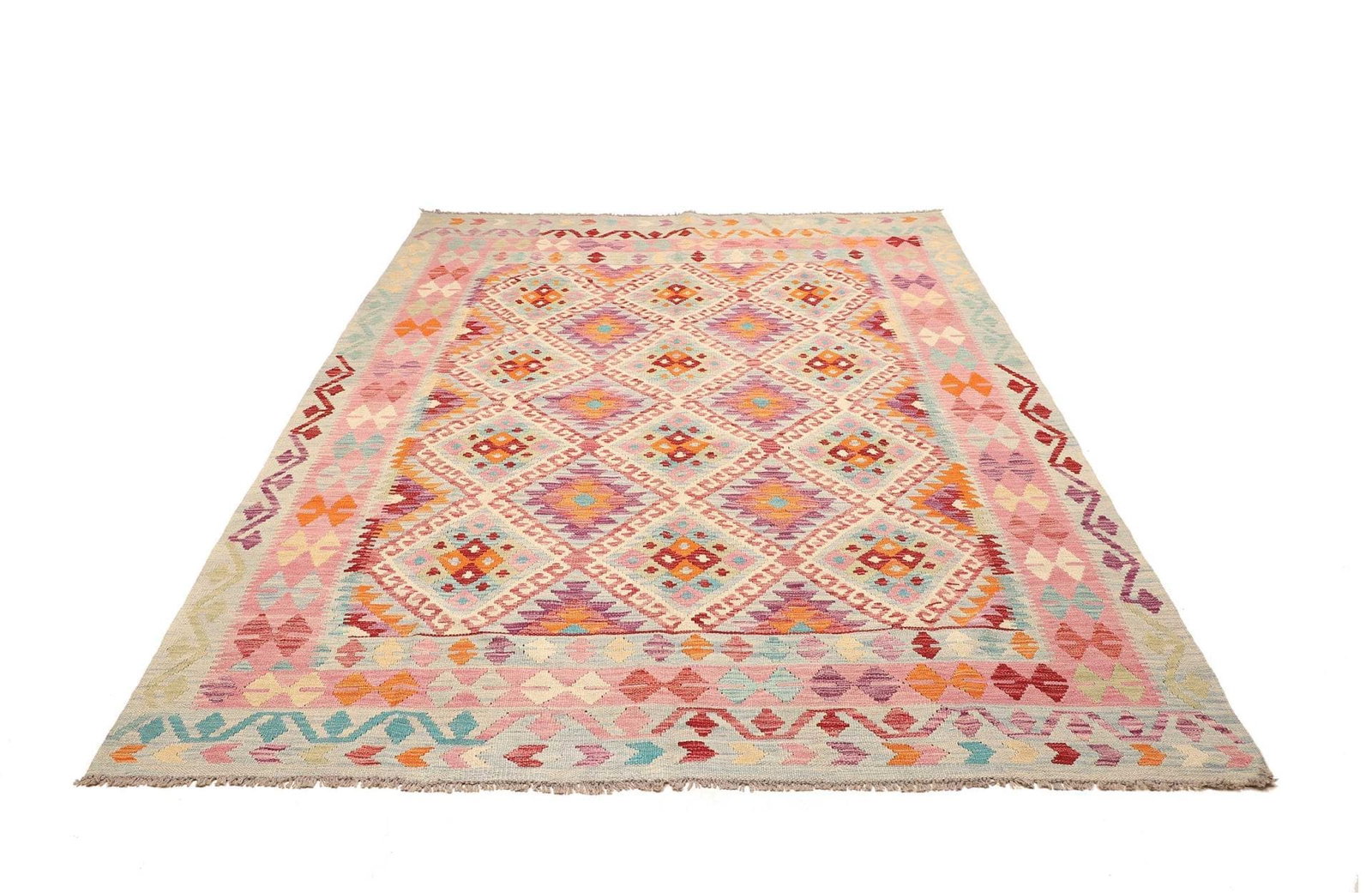 Handgewebter Kelim | Herkunft: Pakistan | Knotendichte: ca. 200.000 Knoten/m² | Material: 100% Schurwolle (Flor) und 100% Baumwolle (Kette) | Größe: 190 x 238 cm | Florhöhe: ca. 5 mm | Vielseitig einsetzbar als Teppich, Vorhang oder Wandschmuck
