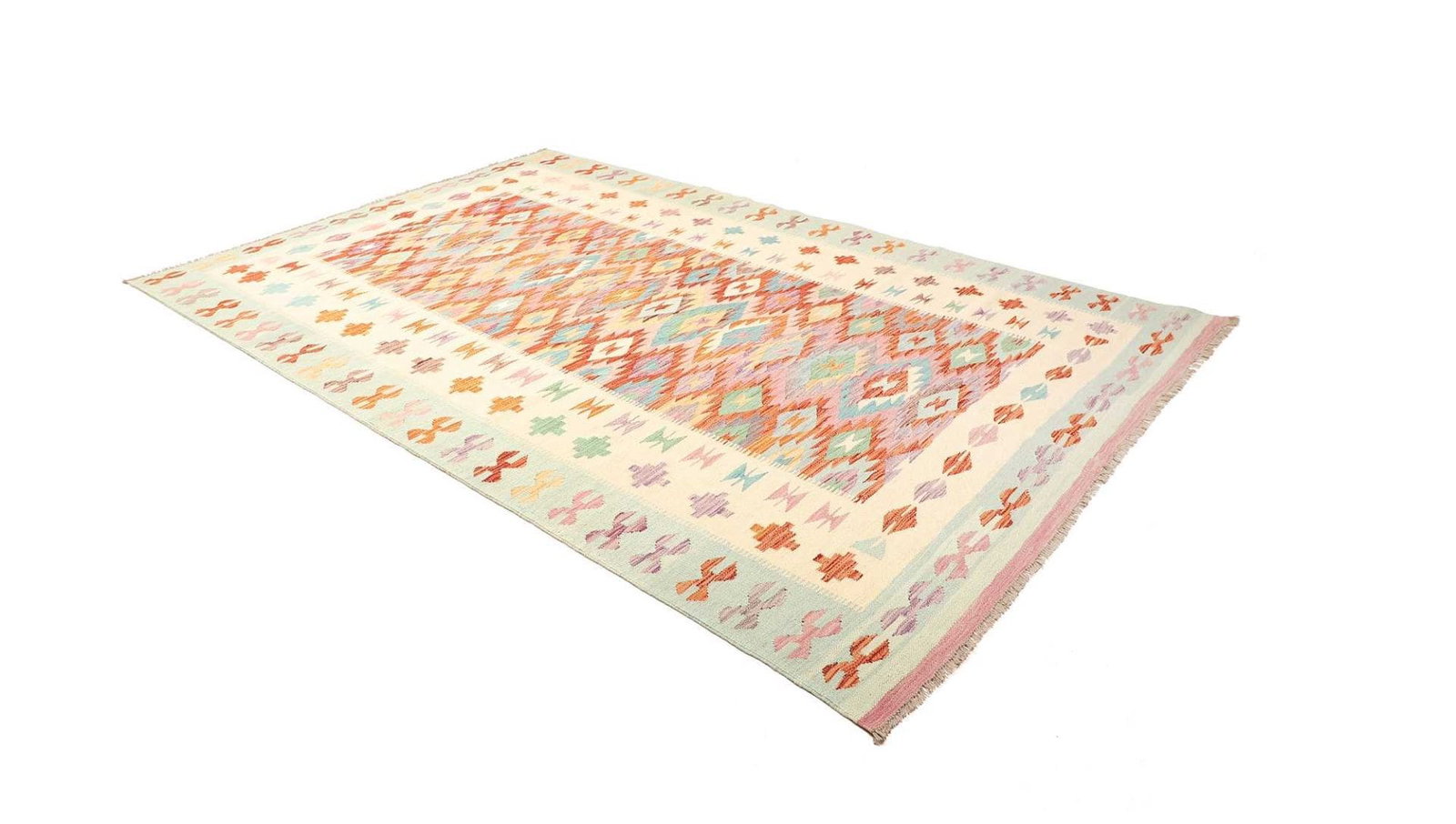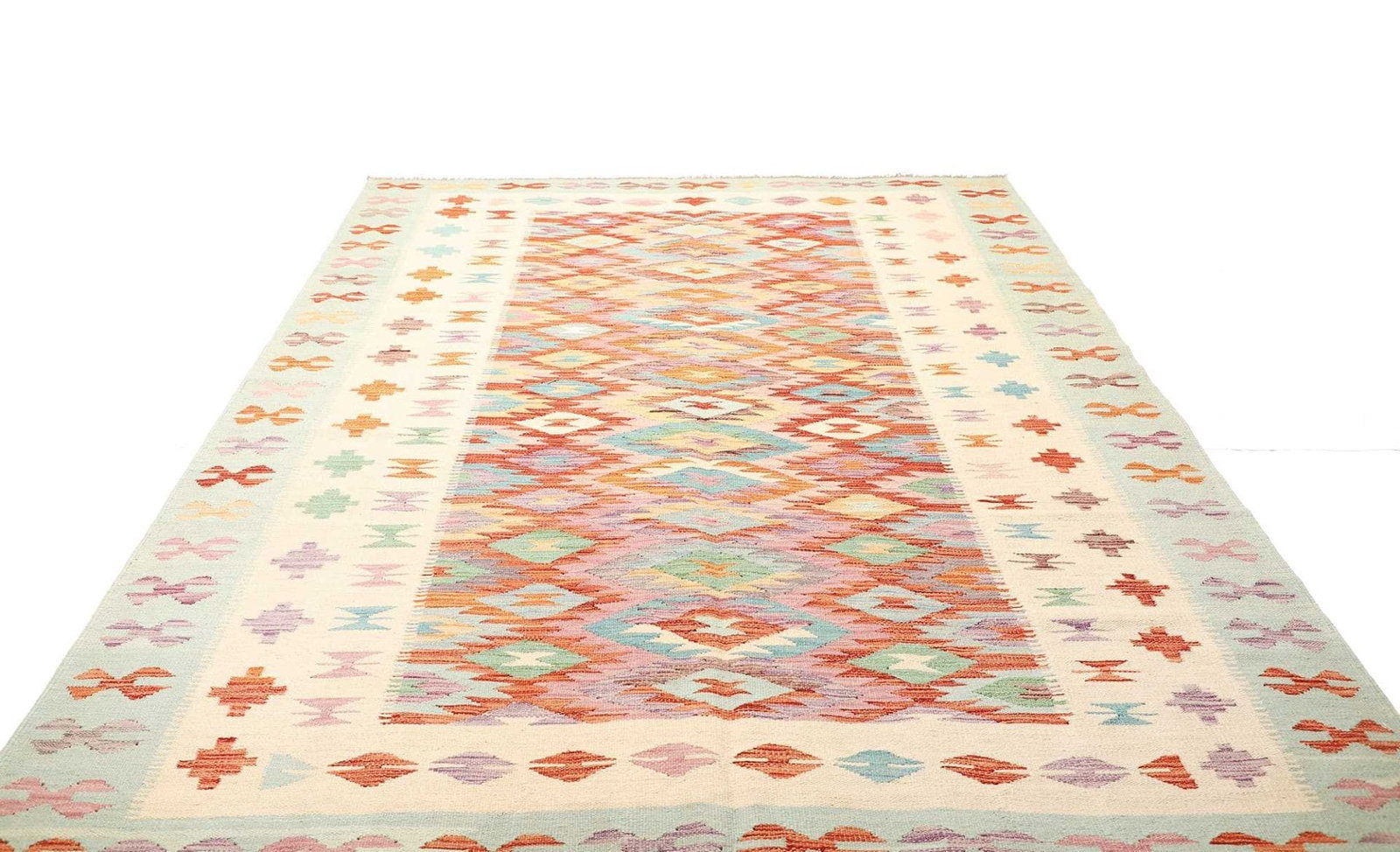 Kelim Teppich | Knotendichte: ca. 200.000 Knoten/m² | Material: 100% Schurwolle | Größe: 203×296 cm | Herkunft: Afghanistan | Zustand: Handgewebte Qualität | Kette: 100% Baumwolle | Florhöhe: ca. 5 mm