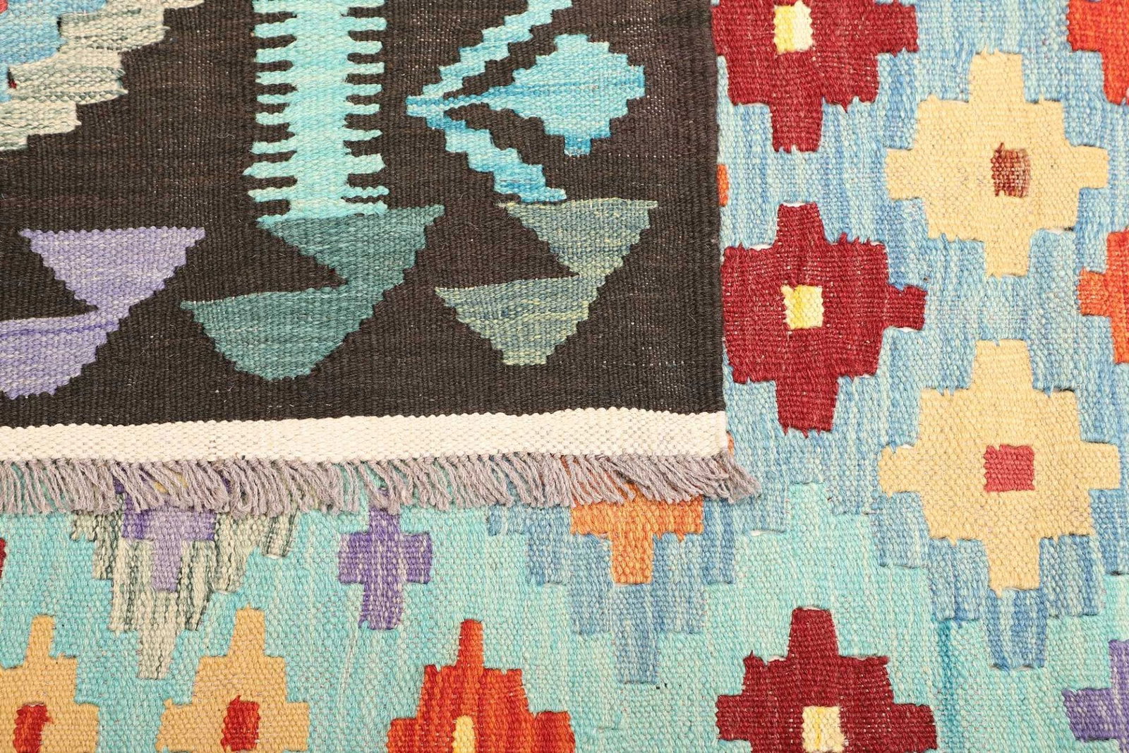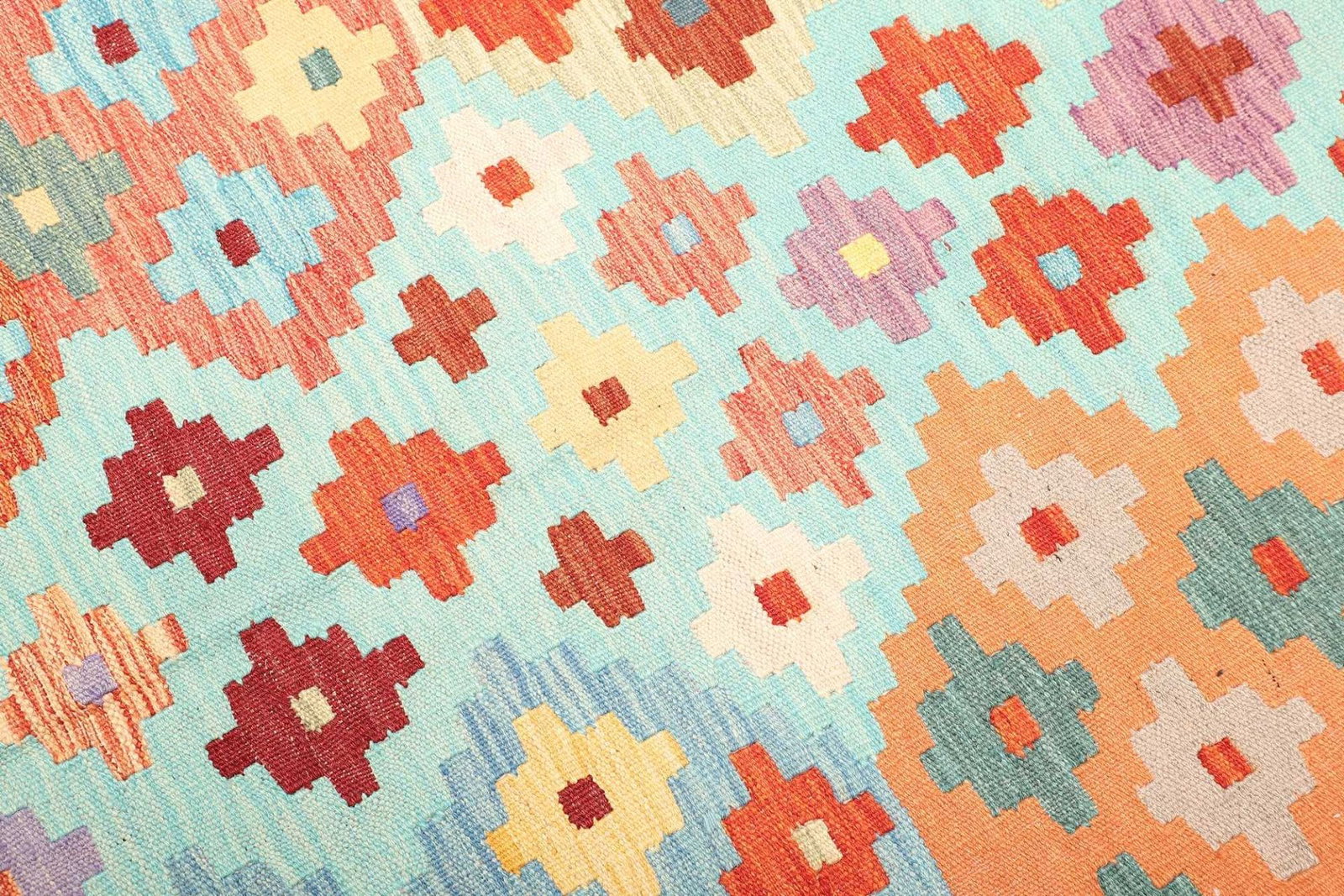 Das Design des Kelim-Teppichs ist farbenfroh und lebendig, mit traditionellen geometrischen Mustern, die oftmals an alte Geschichten und Mythen erinnern. Die Verwendung von kräftigen Farben zieht das Auge an und verleiht jedem Raum Charakter und Wärme. Solche Muster sind typisch für die afghanische Teppichkunst und spiegeln die reiche Kultur wider, aus der sie stammen.