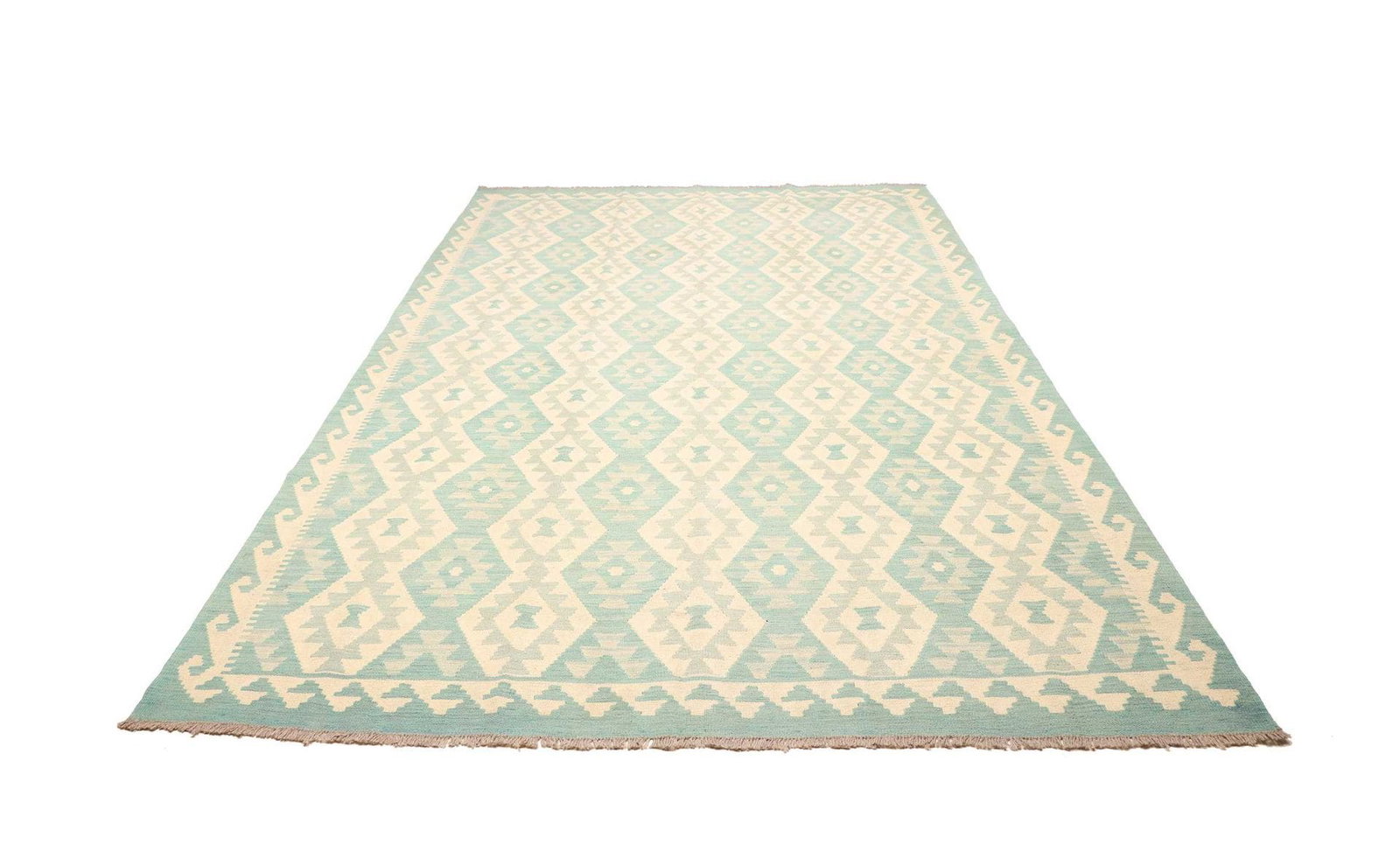 Kelim Teppich | Größe: 204 x 297 cm | Muster: Rustikales Design | Knotendichte: ca. 200.000 Knoten/m² | Flor: 100% Schurwolle | Kette: 100% Baumwolle | Herkunft: Pakistan | Verarbeitung: Handgewebt | Zustand: Sehr gut erhalten
