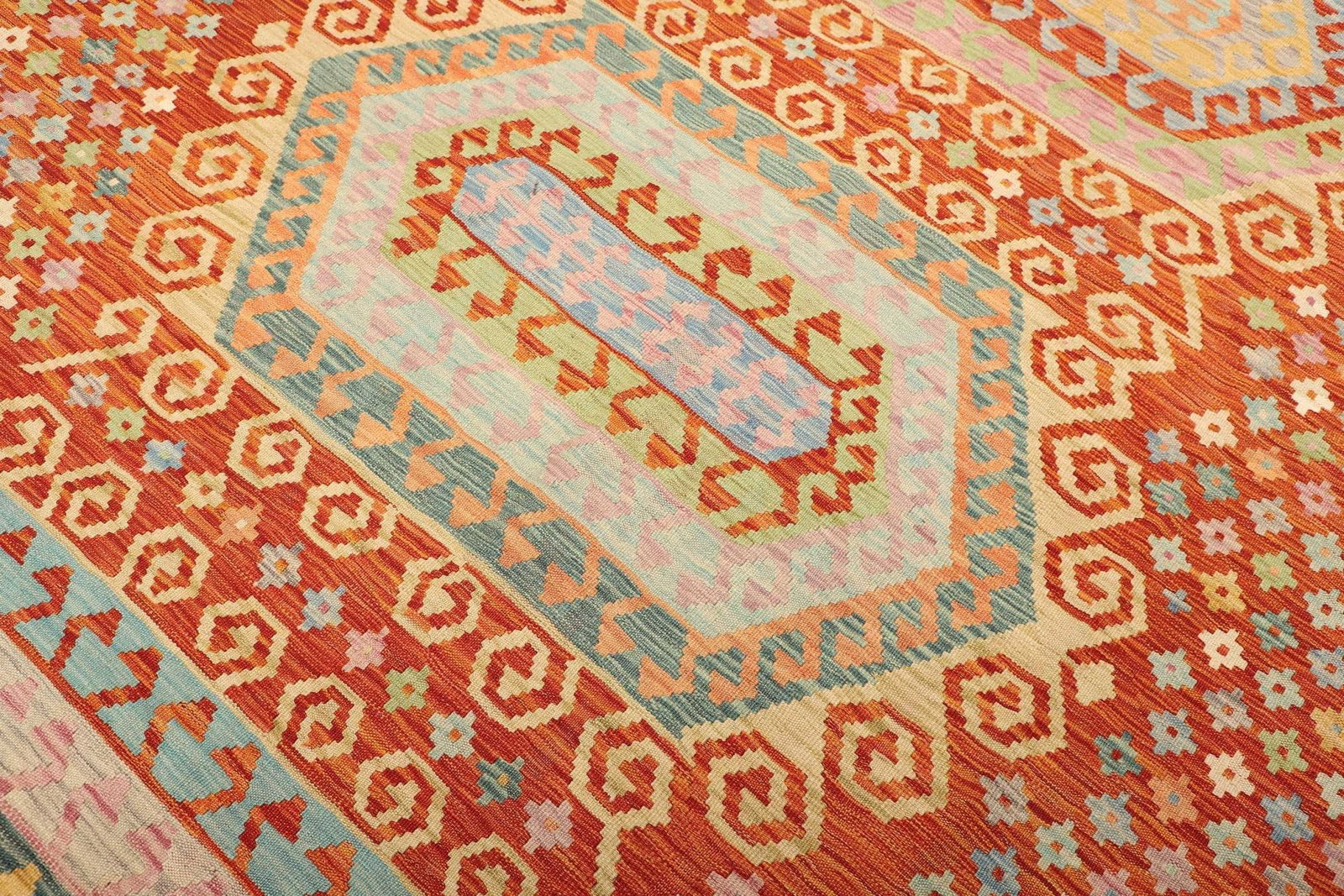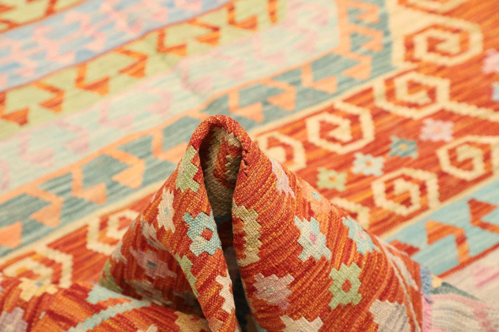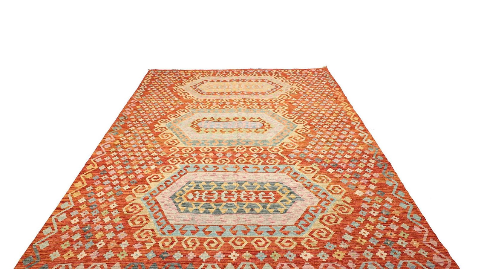 Der Kelim Teppich wird aus 100% Wolle gefertigt, was nicht nur für einen hohen Tragekomfort sorgt, sondern auch die Nachhaltigkeit und Umweltfreundlichkeit des Produkts unterstreicht. Die verwendete Wolle stammt von Tieren, die in ihrer natürlichen Umgebung gezüchtet wurden, was die Qualität und die Eigenschaften des Materials weiter verbessert. Die handgewebte Technik sorgt für eine hohe Knotendichte, die die Strapazierfähigkeit des Teppichs erhöht. Diese traditionelle Technik garantiert, dass jeder Teppich ein Unikat ist, das mit viel Sorgfalt und Liebe zum Detail gefertigt wurde.