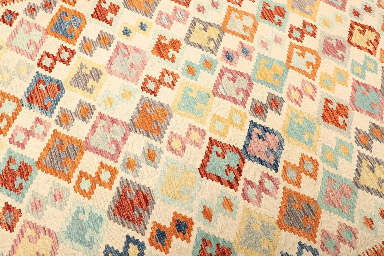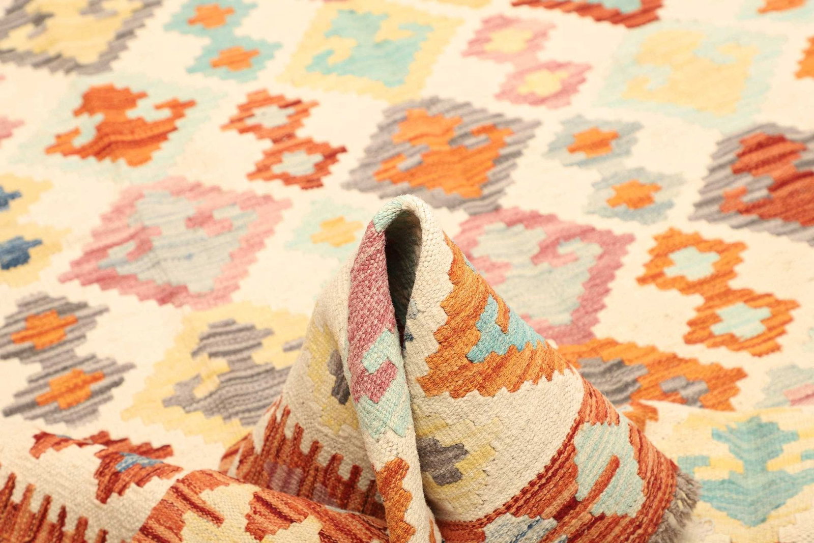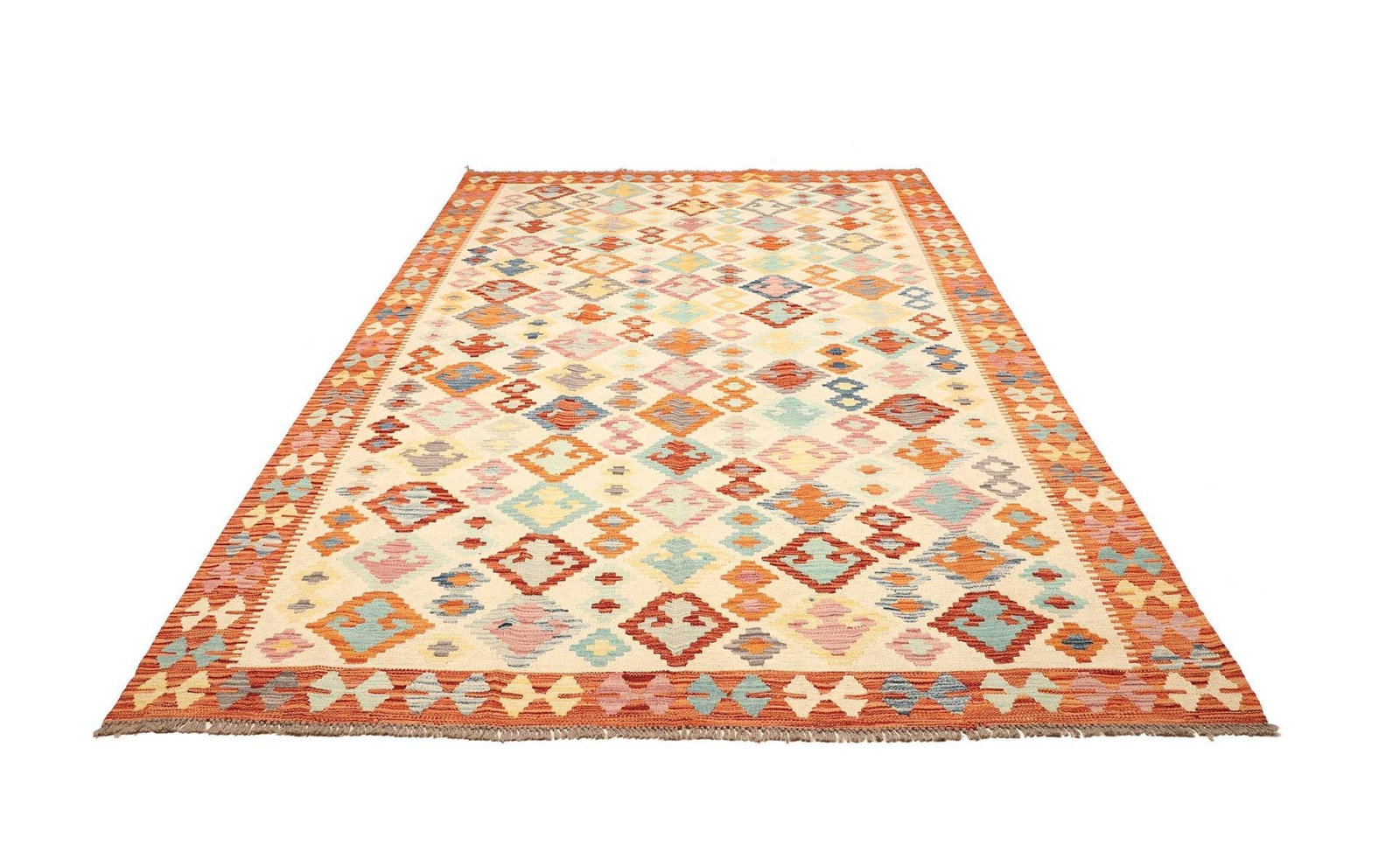 Kelim aus Pakistan | Knotendichte: ca. 200.000 Knoten/m² | Material: 100% Schurwolle im Flor, 100% Baumwolle in der Kette | Größe: 207 x 296 cm | Höhe: ca. 5 mm | Handgewebte Qualität | Vielseitig einsetzbar: auch als Vorhang oder Wandschmuck | Rustikales Flair für moderne Wohnräume