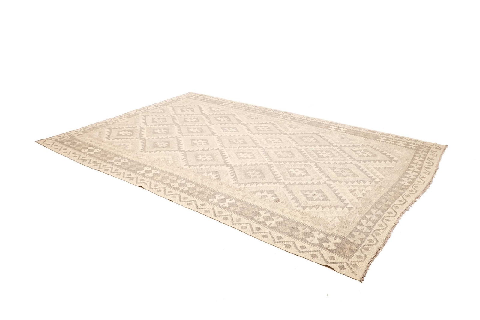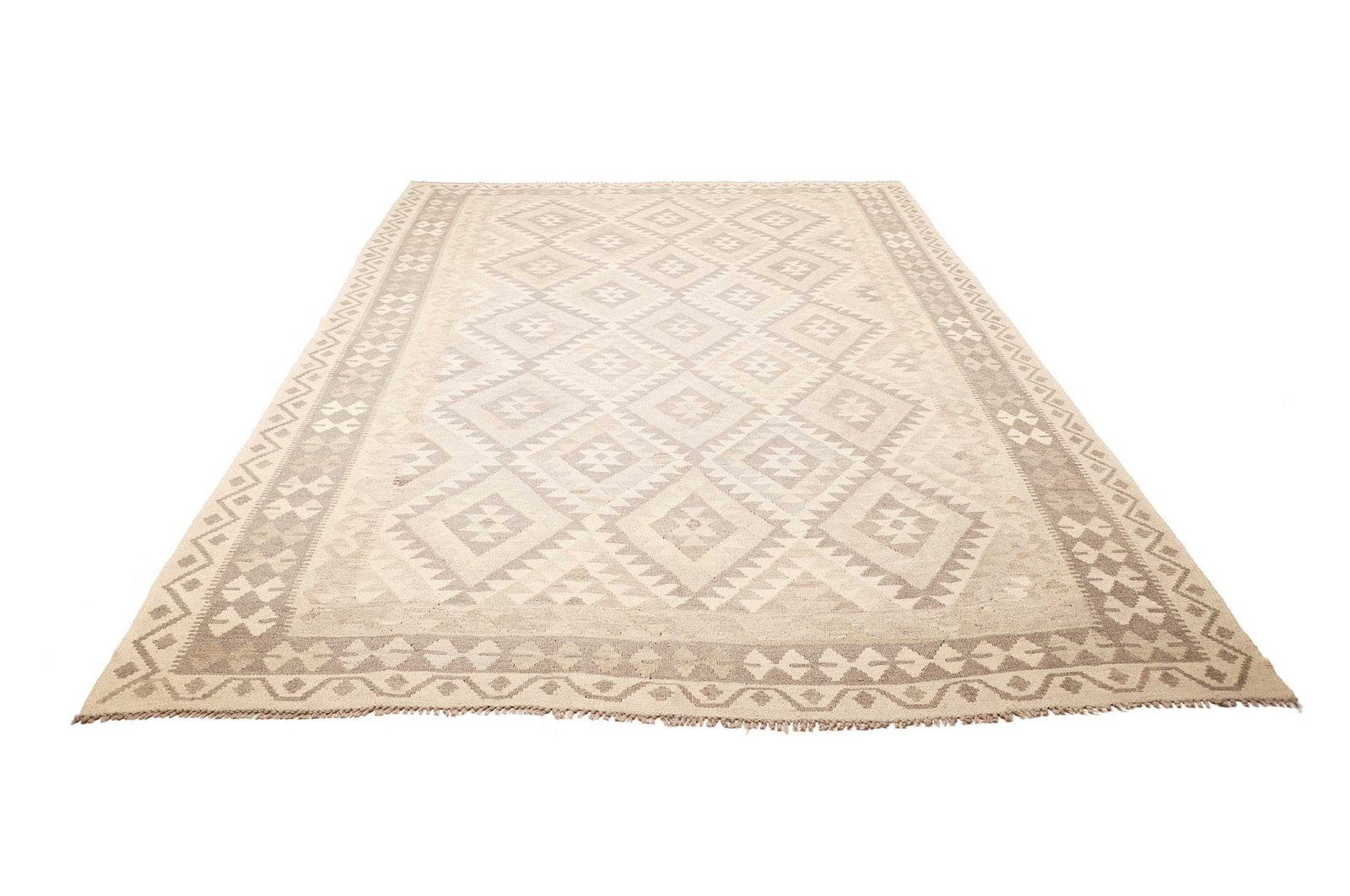 1446$ In den WarenkorbHandgewebter Ghashgai Kelim Teppich aus Wolle in Naturfarbe, Maße 288 x 193 cm