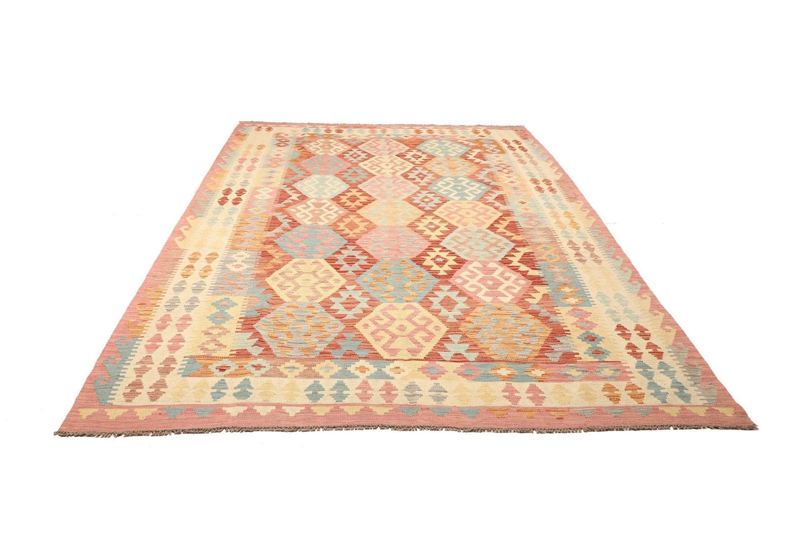 Kelim Teppich | Knotendichte: ca. 200.000 Knoten/m² | Material: 100% Schurwolle (Flor), 100% Baumwolle (Kette) | Größe: 210 x 299 cm | Zustand: Handgewebte Qualität | Herkunft: Pakistan | Höhe: ca. 5 mm | Vielseitig einsetzbar als Teppich, Vorhang oder Wandschmuck