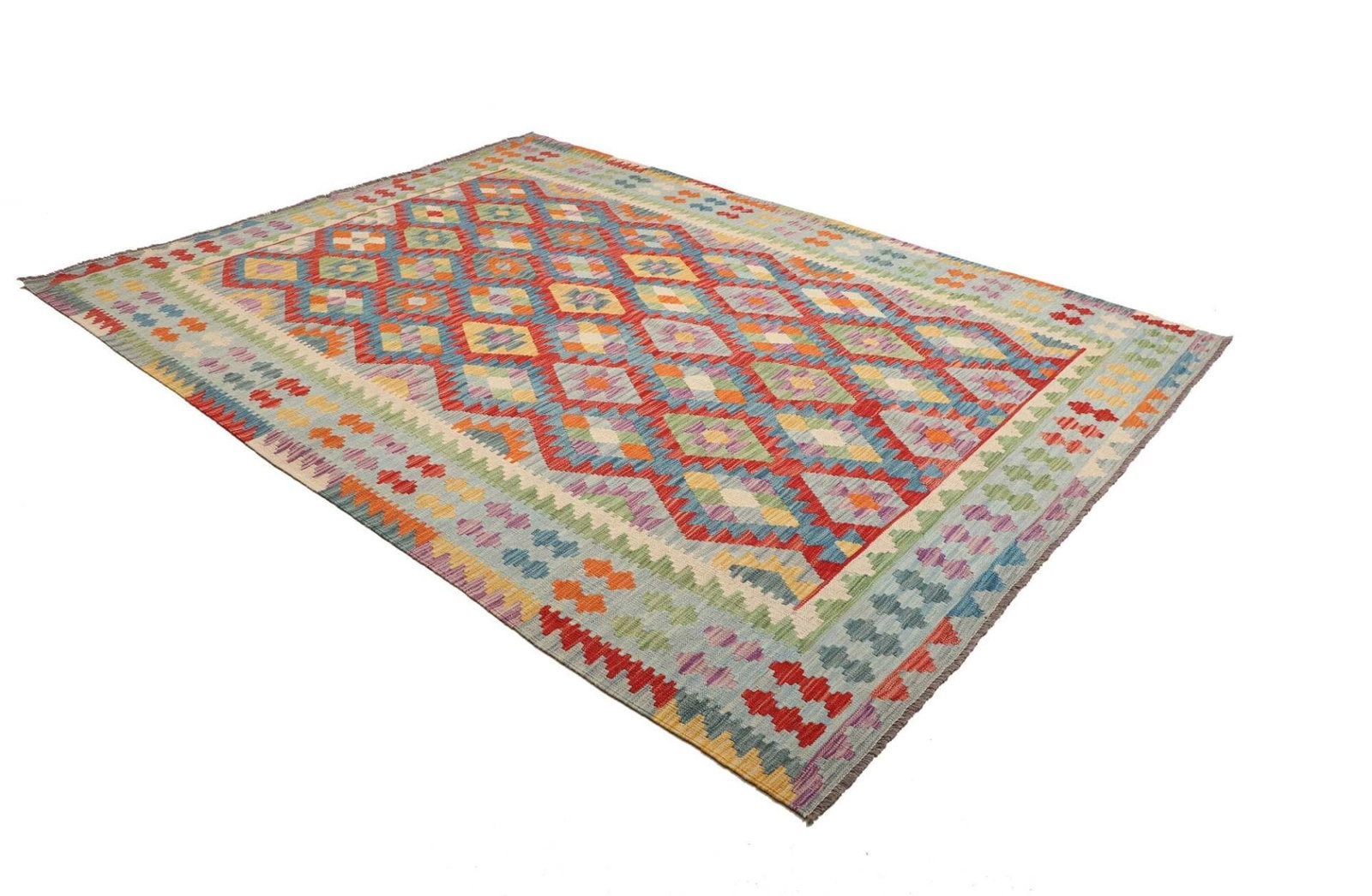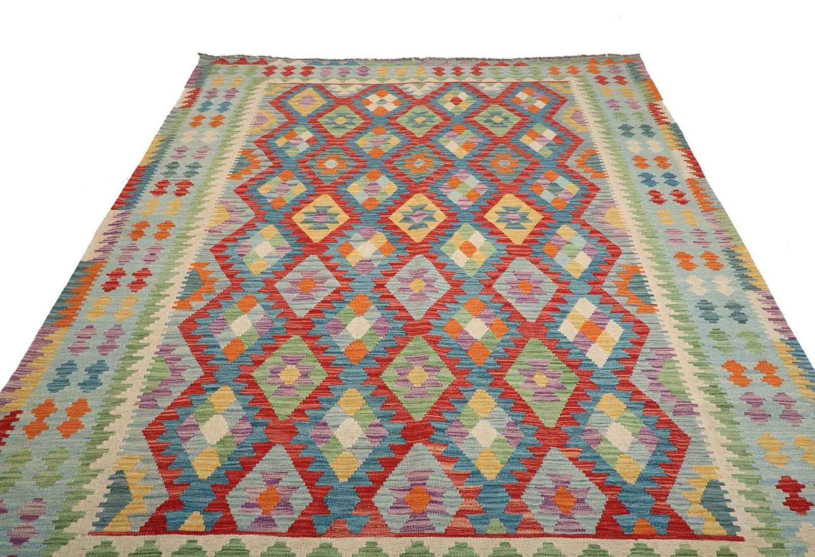 1002$Ursprünglicher Preis war: 1002$865$Aktueller Preis ist: 865$Kelim Teppich | Knotendichte: ca. 200.000 Knoten/m² | Material: 100% Schurwolle | Kette: 100% Baumwolle | Größe: 211 x 287 cm | Herkunft: Pakistan | Höhe: ca. 5 mm | Handgewebte Qualität