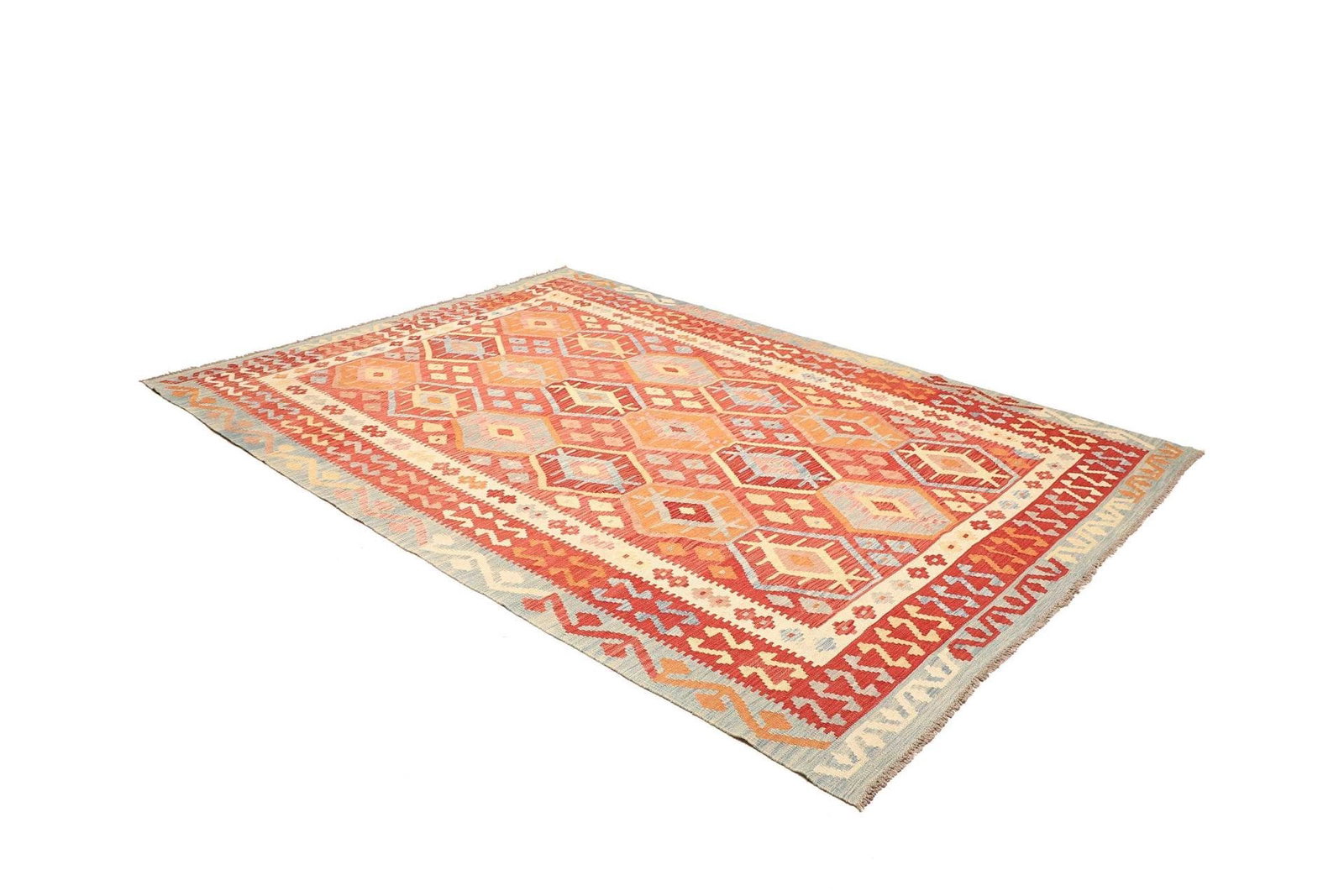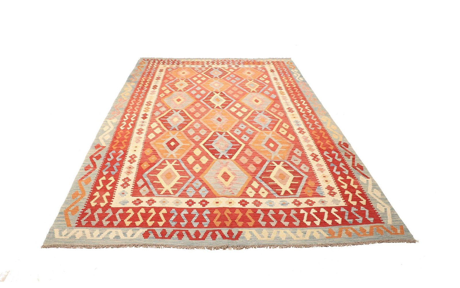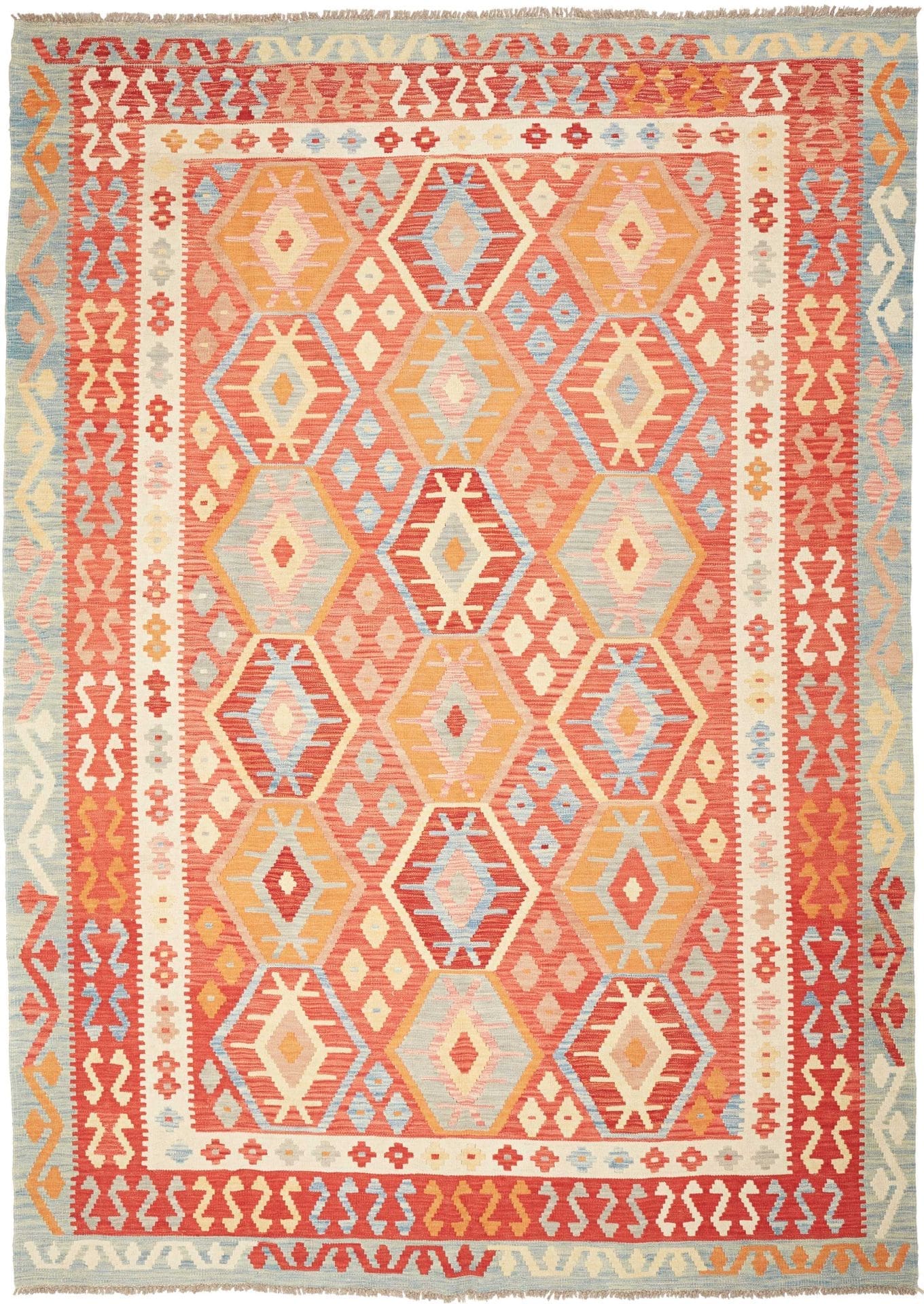 Handgewebter Kelim Teppich | Knotendichte: ca. 200.000 Knoten/m² | Flor: 100% Schurwolle | Kette: 100% Baumwolle | Größe: 216 x 299 cm | Herkunft: Pakistan | Zustand: Sehr gut