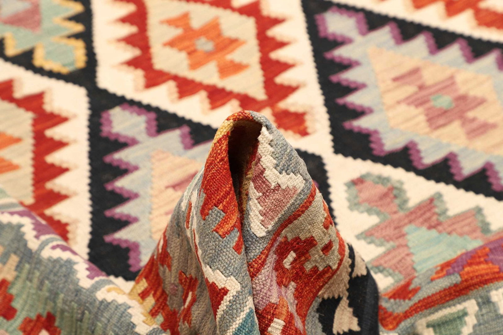 Der Kelim Teppich besticht durch seine exklusive Verarbeitung aus 100% Wolle. Wolle ist bekannt für ihre Robustheit und Langlebigkeit, wodurch der Teppich auch in stark frequentierten Bereichen eingesetzt werden kann. Durch die spezielle handgewebte Technik wird jeder Teppich zu einem Unikat, das zusätzlich zur Ästhetik auch die Tradition des jahrhundertealten Kunsthandwerks widerspiegelt. Die sorgfältige Verarbeitung sorgt dafür, dass der Teppich auch nach vielen Jahren seinen Charme behält und in seiner Farbe und Struktur nicht verblasst.
