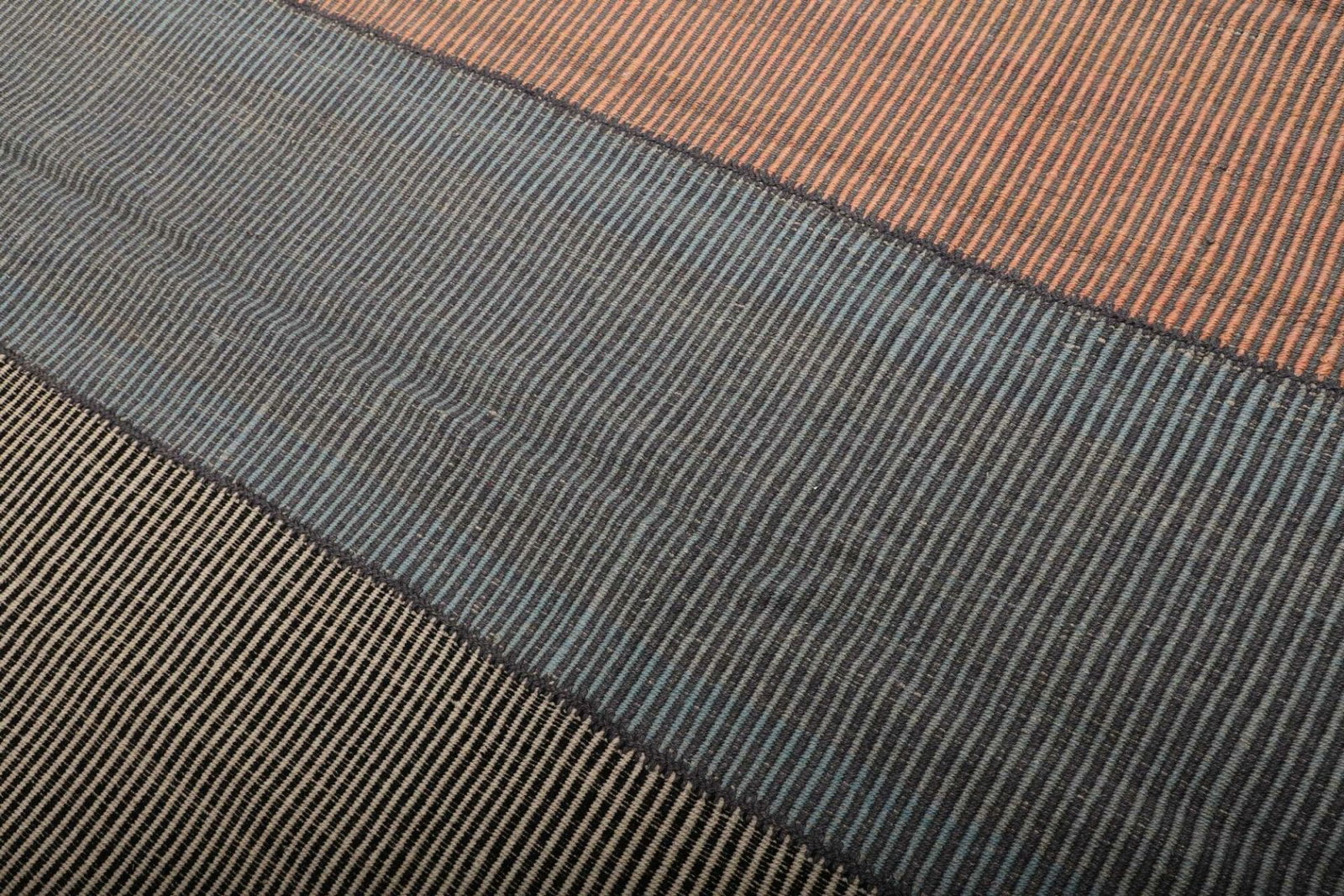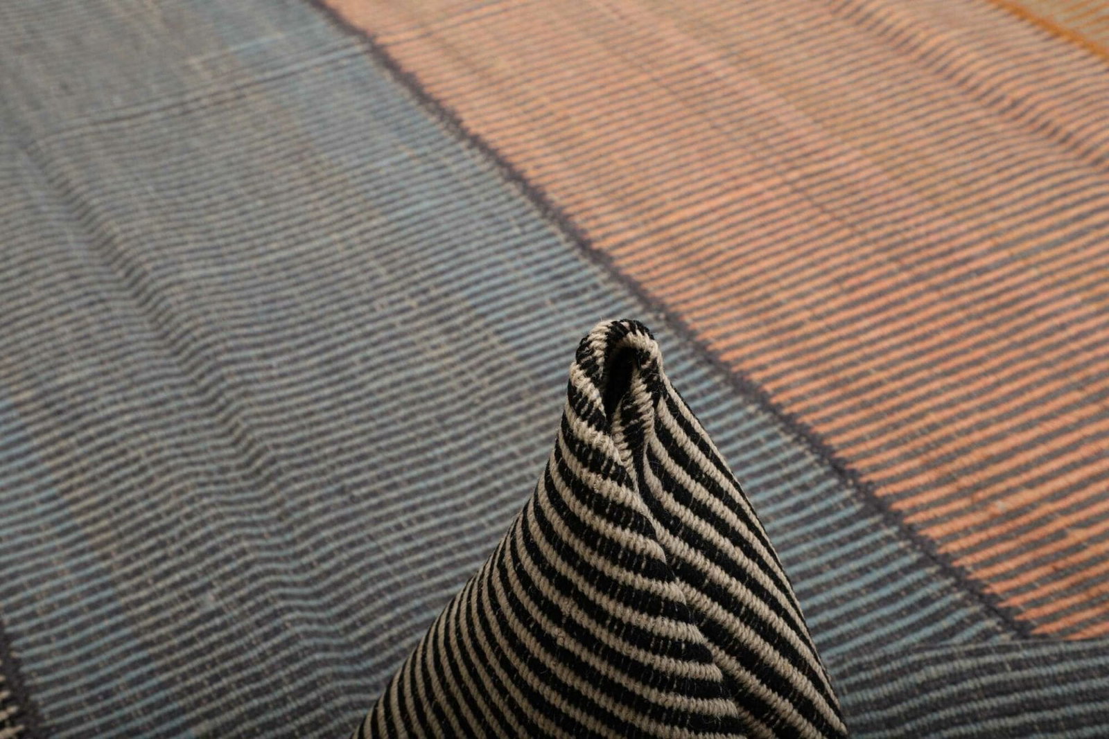 Dieser exquisite Kelim Teppich ist vollständig aus hochwertigen, natürlichen Materialien gefertigt. Das Hauptmaterial besteht aus Wolle, die für ihre Langlebigkeit und Robustheit bekannt ist. Die Verwendung von Wolle sorgt nicht nur für eine angenehme Haptik, sondern auch für eine hervorragende Wärmeisolierung. Durch das Handweben erhält der Teppich seine charakteristische Struktur und Festigkeit, was ihn zu einer ausgezeichneten Wahl für stark frequentierte Räume macht.