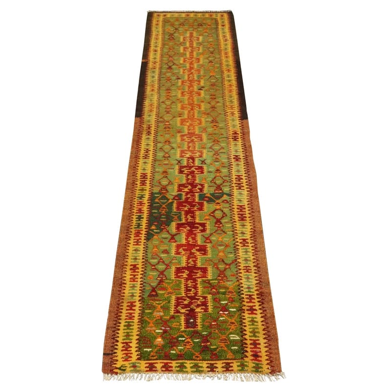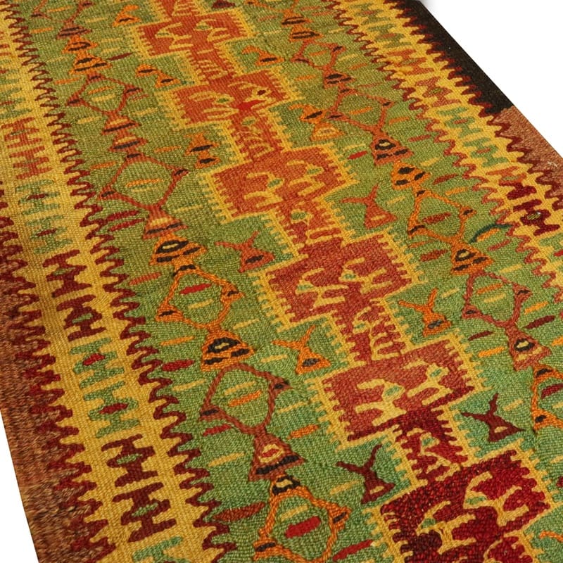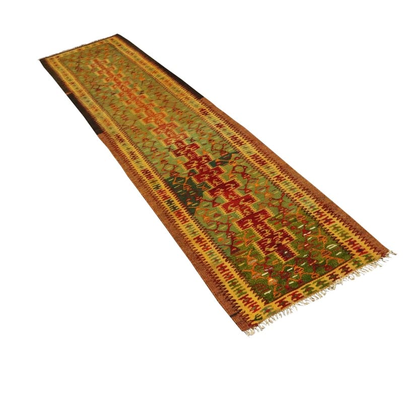 Neuzeitlicher Kelim-Teppich | Handgewebt | Knotendichte: Hoch | Material: Wolle und Baumwolle | Farbe: Grün/Oliv | Größe: 236×58 cm | Gewicht: ca. 2 kg | Herkunft: Iran/Persien | Zustand: Neu | Florhöhe: ca. 6 mm