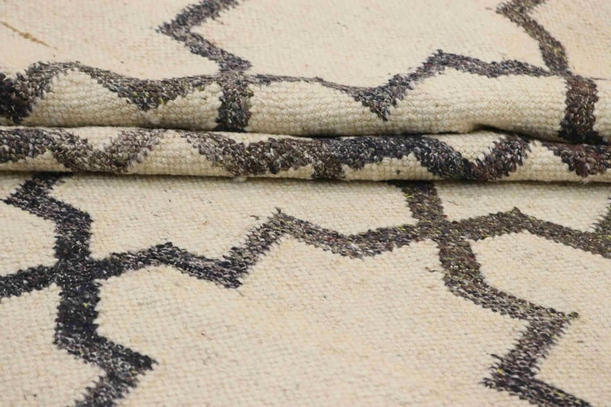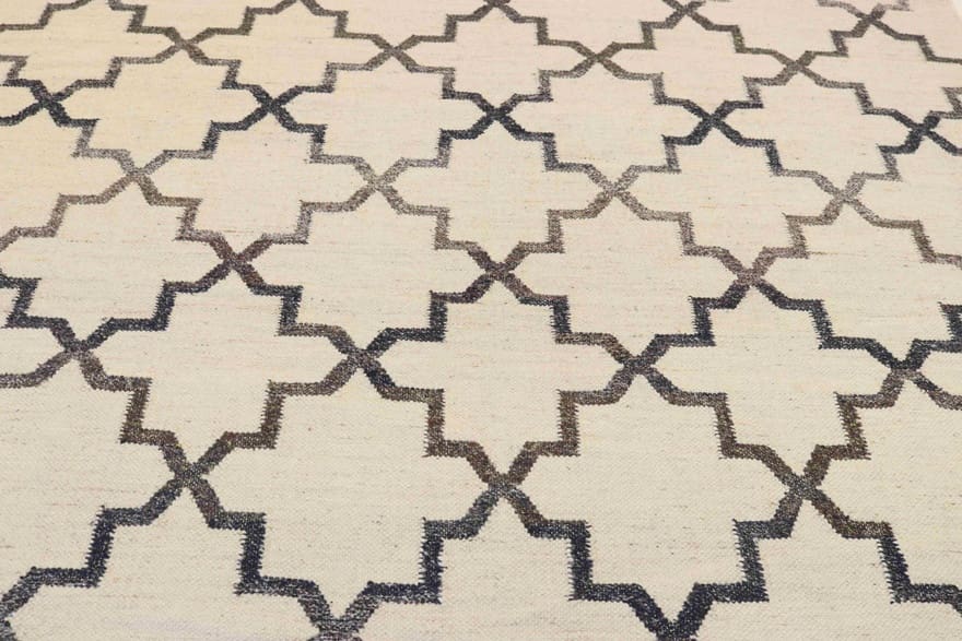Handgewebter Kelim-Teppich | Knotendichte: nicht spezifiziert | Material: Wolle und Baumwolle | Größe: 237×161 cm | In neuem Zustand | Ursprung: Indien | Farbe: Weiß/Beige | Dicke: ca. 4 mm | Gewicht: ca. 6 kg
