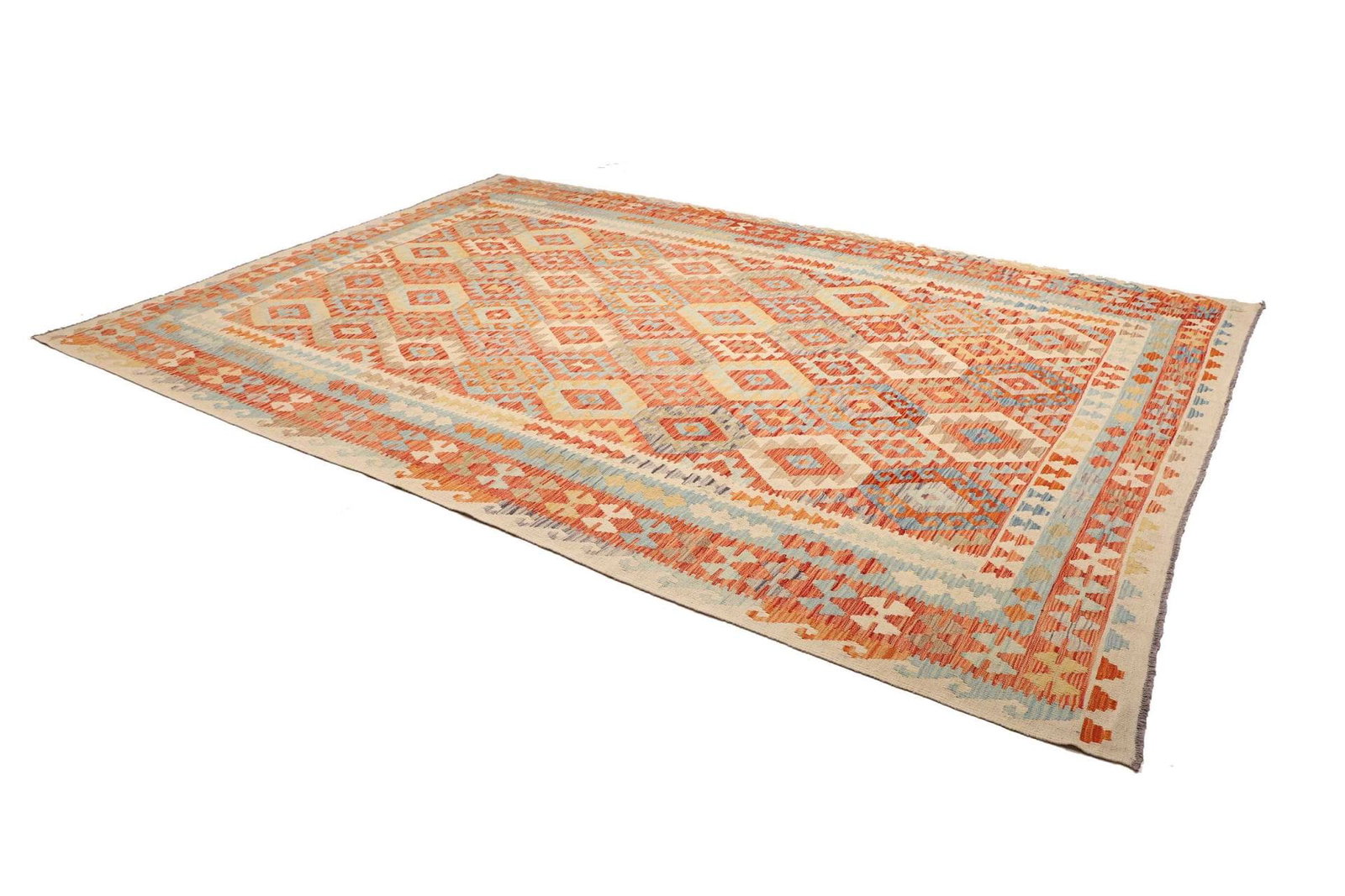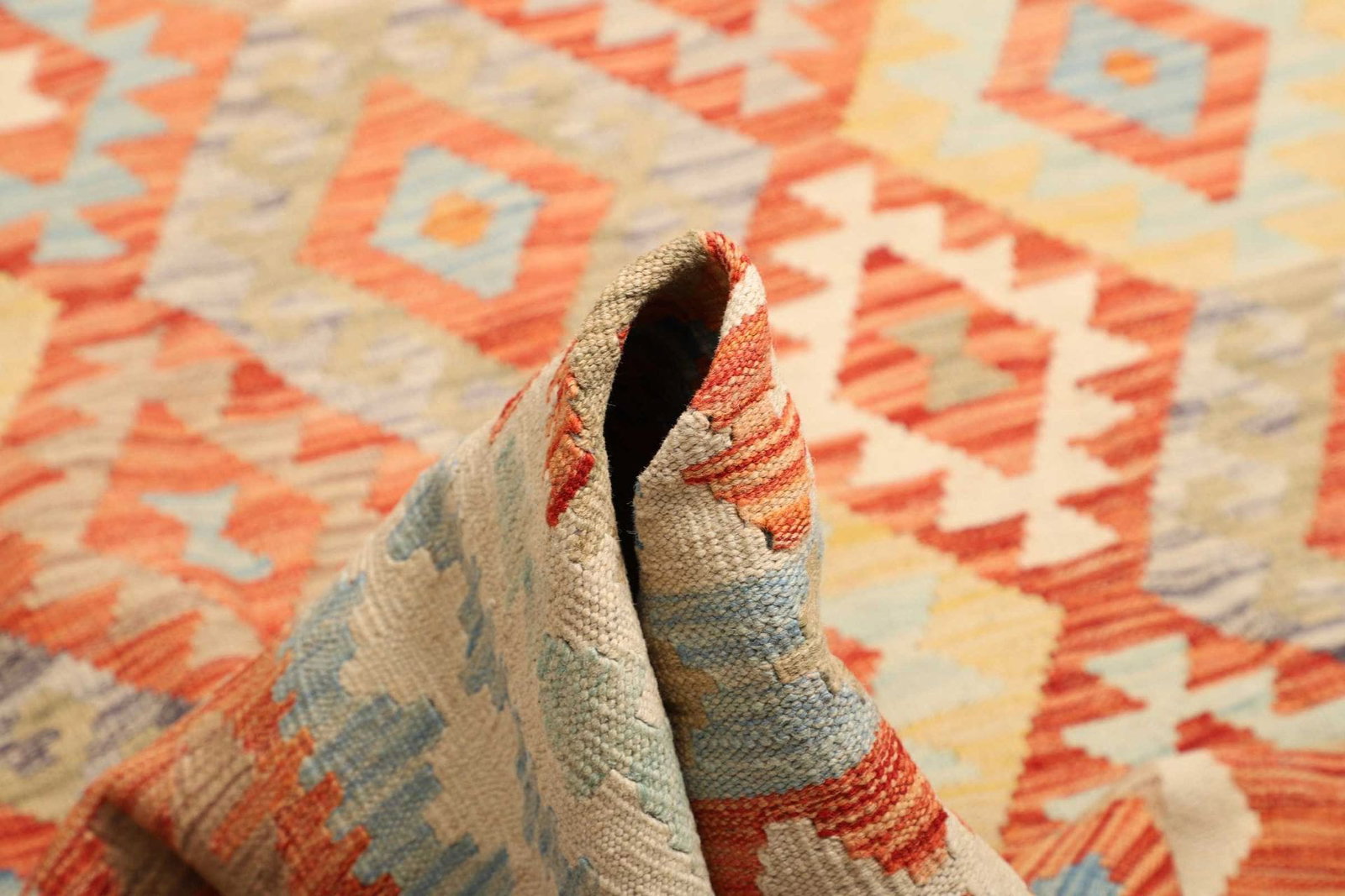 Entdecken Sie den einzigartigen Kelim Teppich, der durch seine hohe Qualität und authentische Handwerkskunst besticht. Der Teppich ist aus feiner Schurwolle gefertigt und besteicht durch seine robuste, gleichzeitig jedoch weiche Textur. Die handgewebte Technik verleiht diesem Orientteppich nicht nur eine individuelle Note, sondern garantiert auch Langlebigkeit und beständige Schönheit. Jeder Teppich erzählt seine eigene Geschichte, und dieser Kelim ist ein beeindruckendes Beispiel für traditionelle Handwerkskunst.