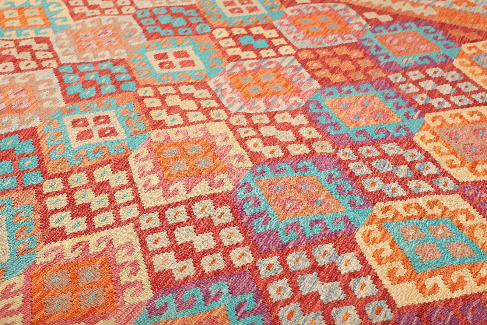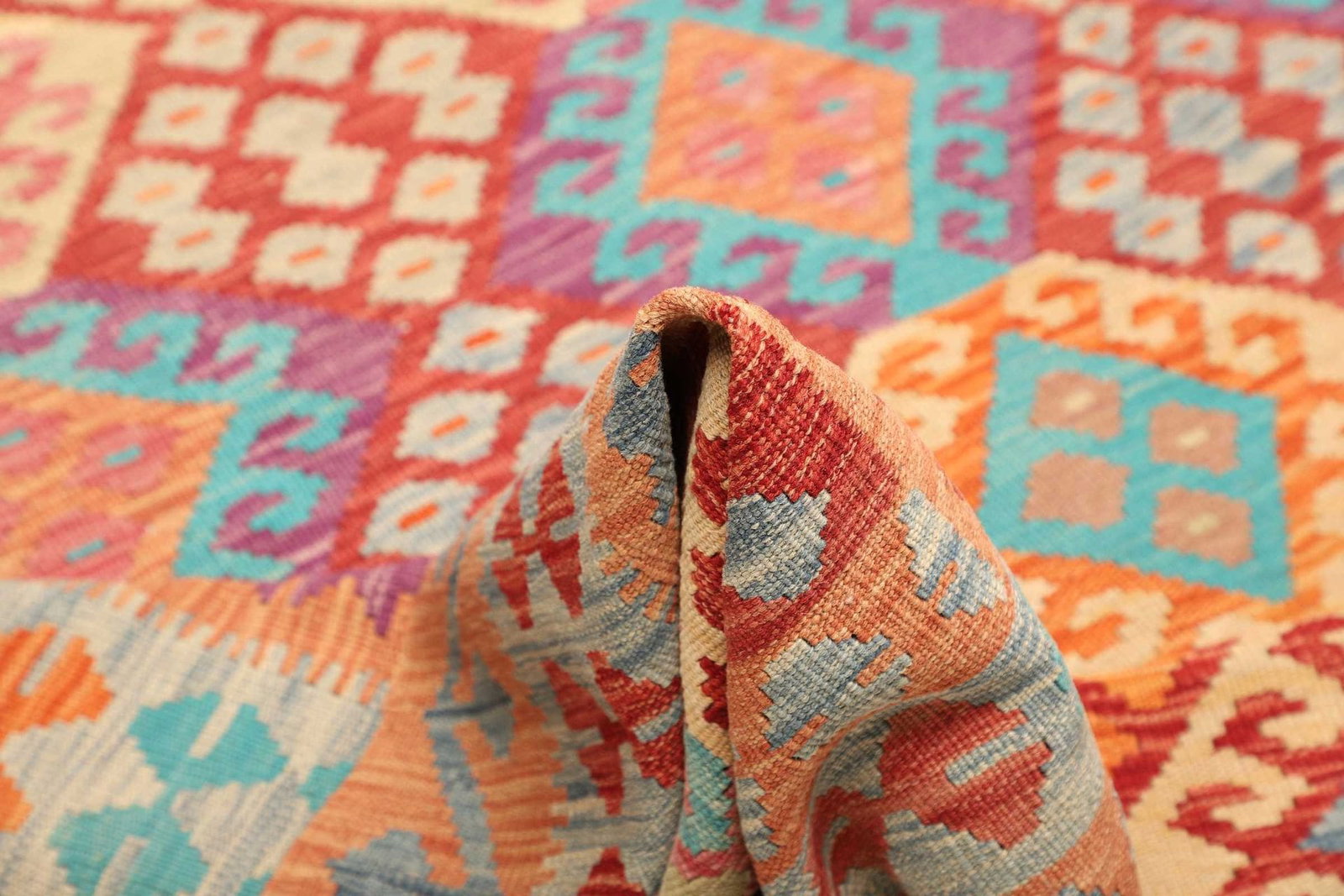 Der Teppich ist aus hochwertiger Schurwolle gefertigt, ein Material, das für seine Weichheit und Strapazierfähigkeit bekannt ist. Schurwolle ist nicht nur angenehm unter den Füßen, sondern bietet auch eine hervorragende Isolierung, sowohl gegen Kälte als auch gegen Wärme. Der handgewebte Kelim-Technik verleiht diesem Teppich eine flache Struktur, die ihn besonders gut als Bodenbelag für stark frequentierte Bereiche geeignet macht. Die hohe Knotendichte sorgt dafür, dass die Farben und Muster in einem beeindruckenden Detailreichtum zum Ausdruck kommen.