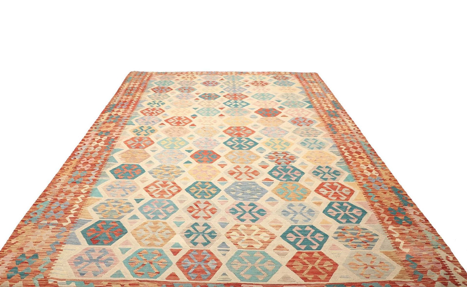 1358$Ursprünglicher Preis war: 1358$1211$Aktueller Preis ist: 1211$Handgewebter Kelim aus Pakistan | Knotendichte: ca. 200.000 Knoten/m² | Material: 100% Schurwolle (Flor), 100% Baumwolle (Kette) | Größe: 253 x 334 cm | Höhe: ca. 5 mm | Zustand: Sehr gut | Herkunft: Pakistan