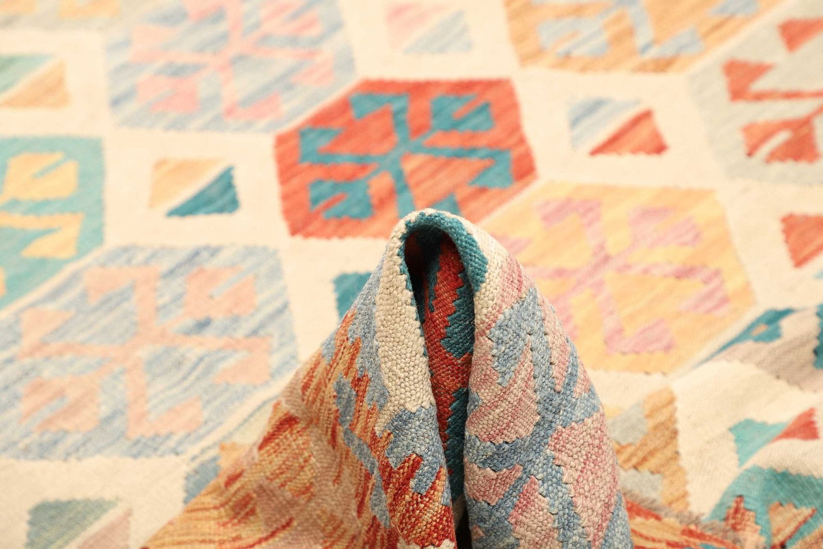 Ein herausragendes Merkmal dieses handgewebten Kelim Teppichs ist die Kombination aus Funktionalität und ästhetischem Reiz. Die flache Webart ermöglicht es, den Teppich in nahezu jedem Raum zu platzieren, ohne dabei an Komfort oder Stil zu verlieren. Er eignet sich ideal für stark frequentierte Bereiche wie Wohnzimmer, Eingangsbereiche oder Küchen, wo er sowohl als dekoratives Element als auch als praktischer Schutz des Bodenbelags dient. Zudem entwickelt sich mit der Zeit durch die Nutzung eine besondere Patina, die dem Teppich einen Charme verleiht, der nur durch die Jahre der Treue gewinnt.
