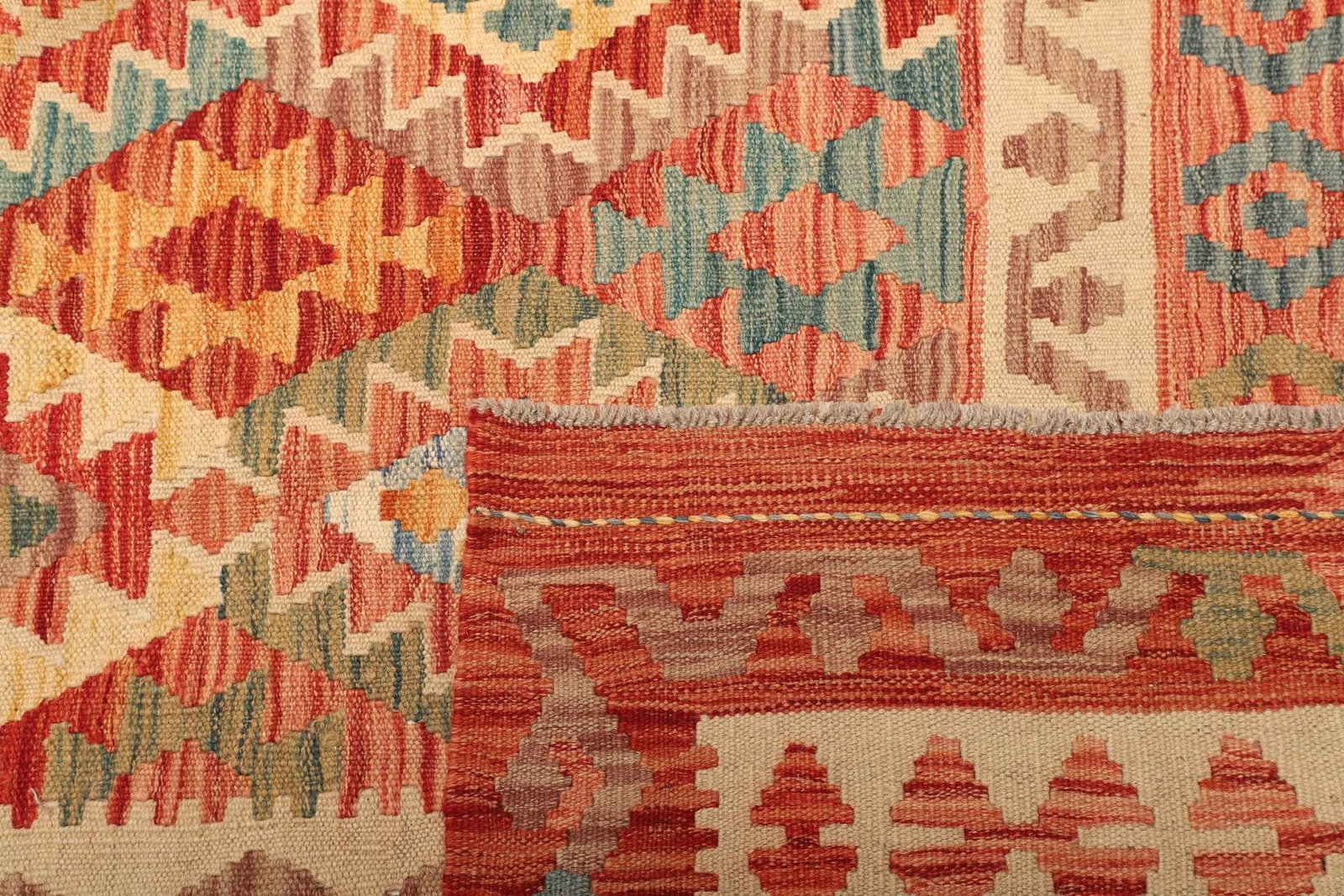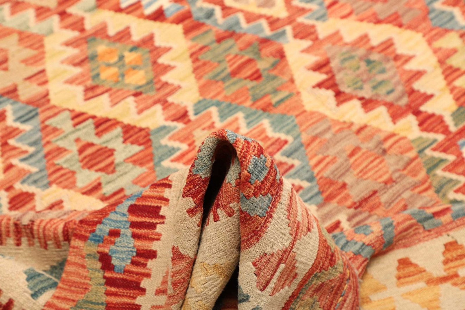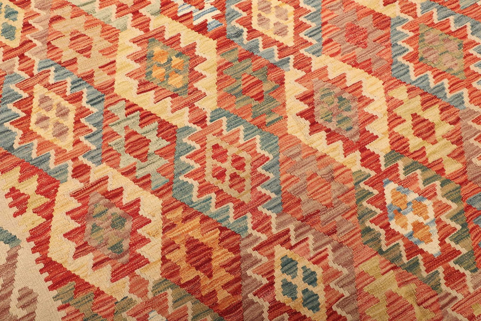 Der Teppich ist vollständig handgewebt, was ihn zu einem Unikat macht. Diese traditionelle Technik, die über Generationen weitergegeben wurde, garantiert eine hervorragende Verarbeitung und ein einzigartiges Design. Die Schurwolle, aus der dieser Kelim besteht, zeichnet sich durch ihre natürliche Weichheit und Strapazierfähigkeit aus. Diese Materialwahl sorgt nicht nur für hohe Qualitätsstandards, sondern auch für eine angenehme Fußwärme in der kälteren Jahreszeit.