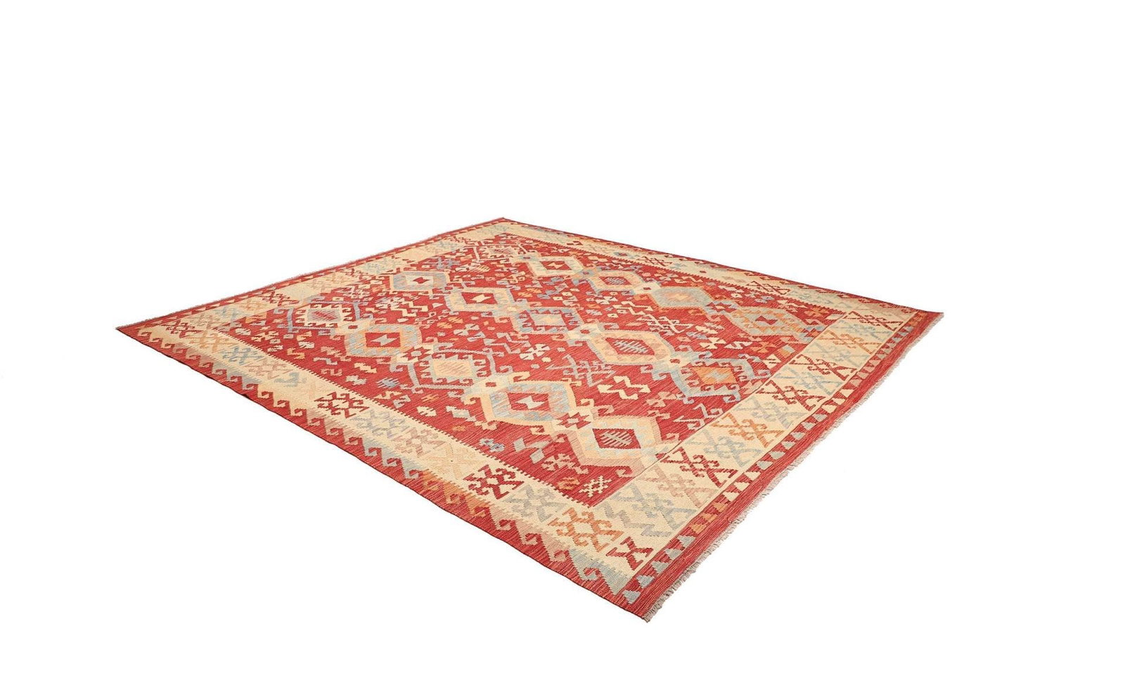 1025$Ursprünglicher Preis war: 1025$861$Aktueller Preis ist: 861$Kelim Teppich | Knotendichte: ca. 200.000 Knoten/m² | Material: 100% Schurwolle und 100% Baumwolle | Größe: 257 x 286 cm | Höhe: ca. 5 mm | Herkunft: Pakistan | Zustand: Handgewebt, in ausgezeichnetem Zustand