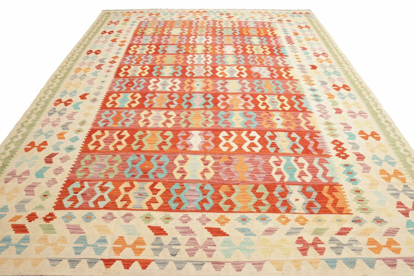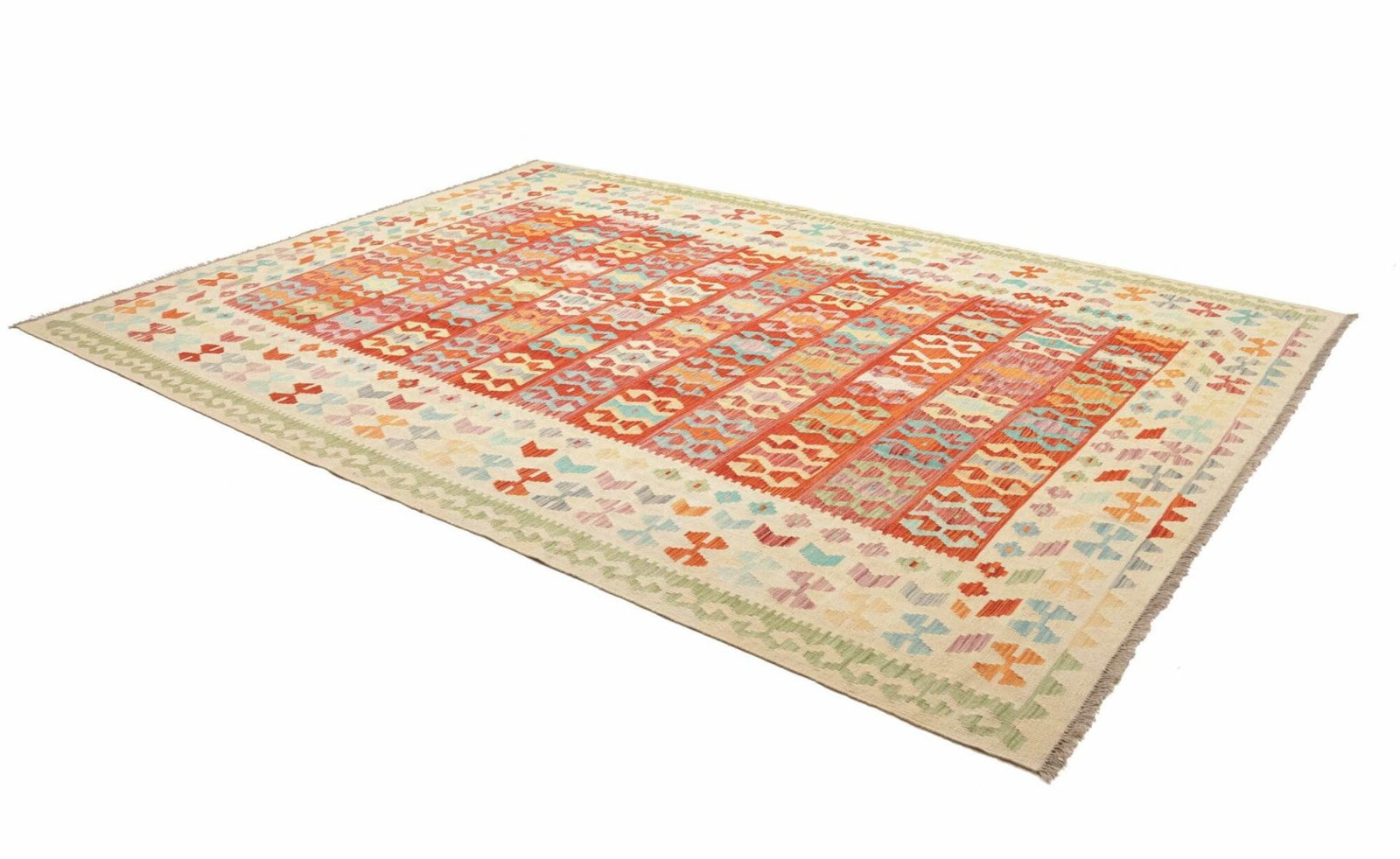Kelim Teppich | Knotendichte: ca. 200.000 Knoten/m² | Material: 100% Schurwolle (Flor), 100% Baumwolle (Kette) | Größe: 257 x 350 cm | Herkunft: Pakistan | Zustand: Handgewebt | Höhe: ca. 5 mm