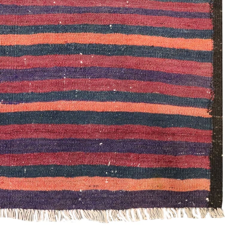Ein herausragendes Merkmal dieses Kelim Teppichs ist seine Vielseitigkeit. Er kann nicht nur als Bodenbelag verwendet werden, sondern auch als Wandbehang oder Decke für Möbel. Zudem ist er durch seine fortgeschrittene Handwebtechnik äußerst strapazierfähig und lässt sich leicht reinigen. Dies macht ihn zu einer idealen Wahl für Haushalte mit viel Verkehr, sowie für Familien mit Kindern oder Haustieren.