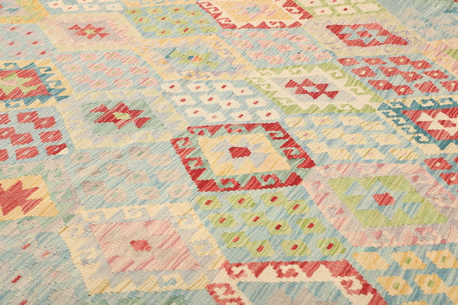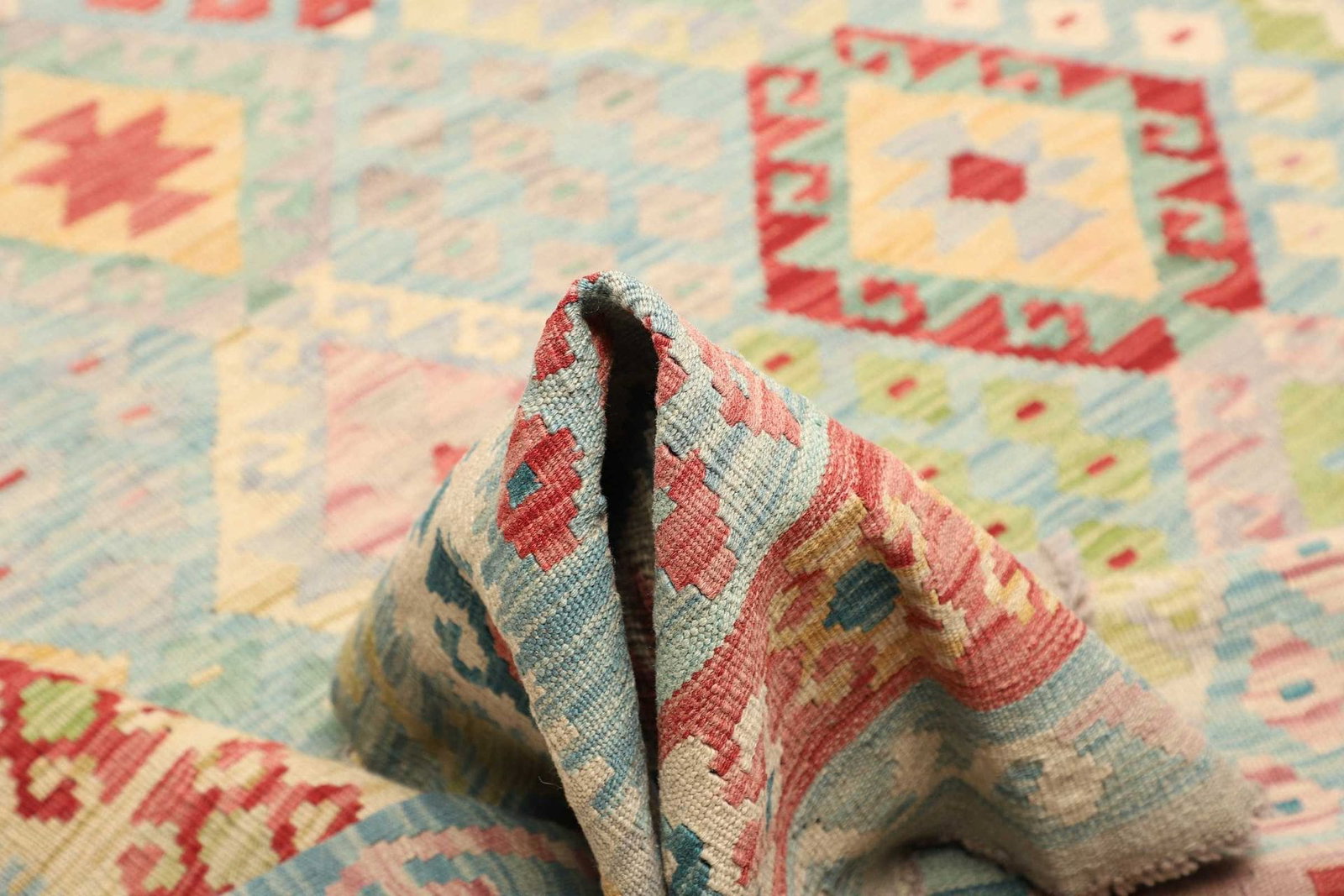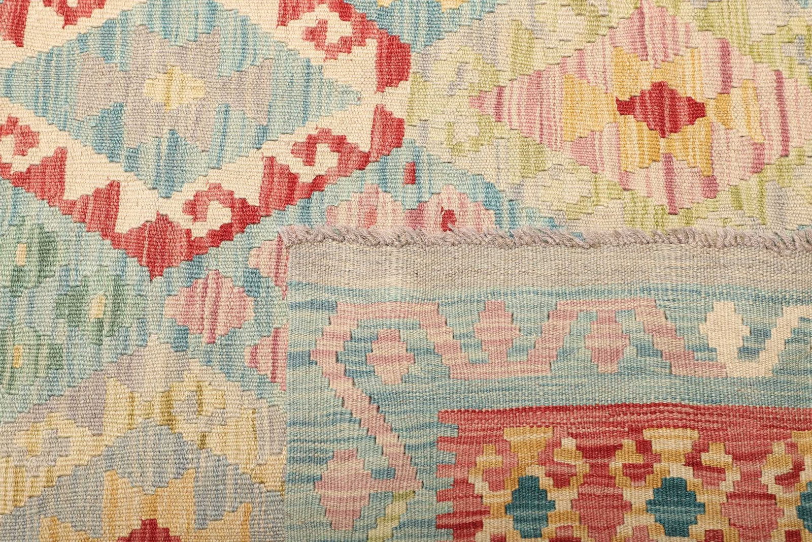 Dieser Kelim Teppich ist aus 100% feiner Wolle gefertigt. Wolle ist nicht nur bekannt für ihre Weichheit und Strapazierfähigkeit, sondern auch für ihre natürliche Schmutzabweisung und Langlebigkeit. Die handgewebte Technik sorgt dafür, dass jeder Teppich ein Unikat ist, da keine Maschine die kreative Kunstfertigkeit und Liebe zum Detail des Handwerks ersetzen kann. Die Knotendichte bei handgewebten Teppichen sorgt für eine hohe Qualität und Stabilität, die Ihnen über viele Jahre Freude bereiten wird. Der Teppich ist leicht zu reinigen und behält auch nach jahrelanger Nutzung seine Farben und Strukturen.