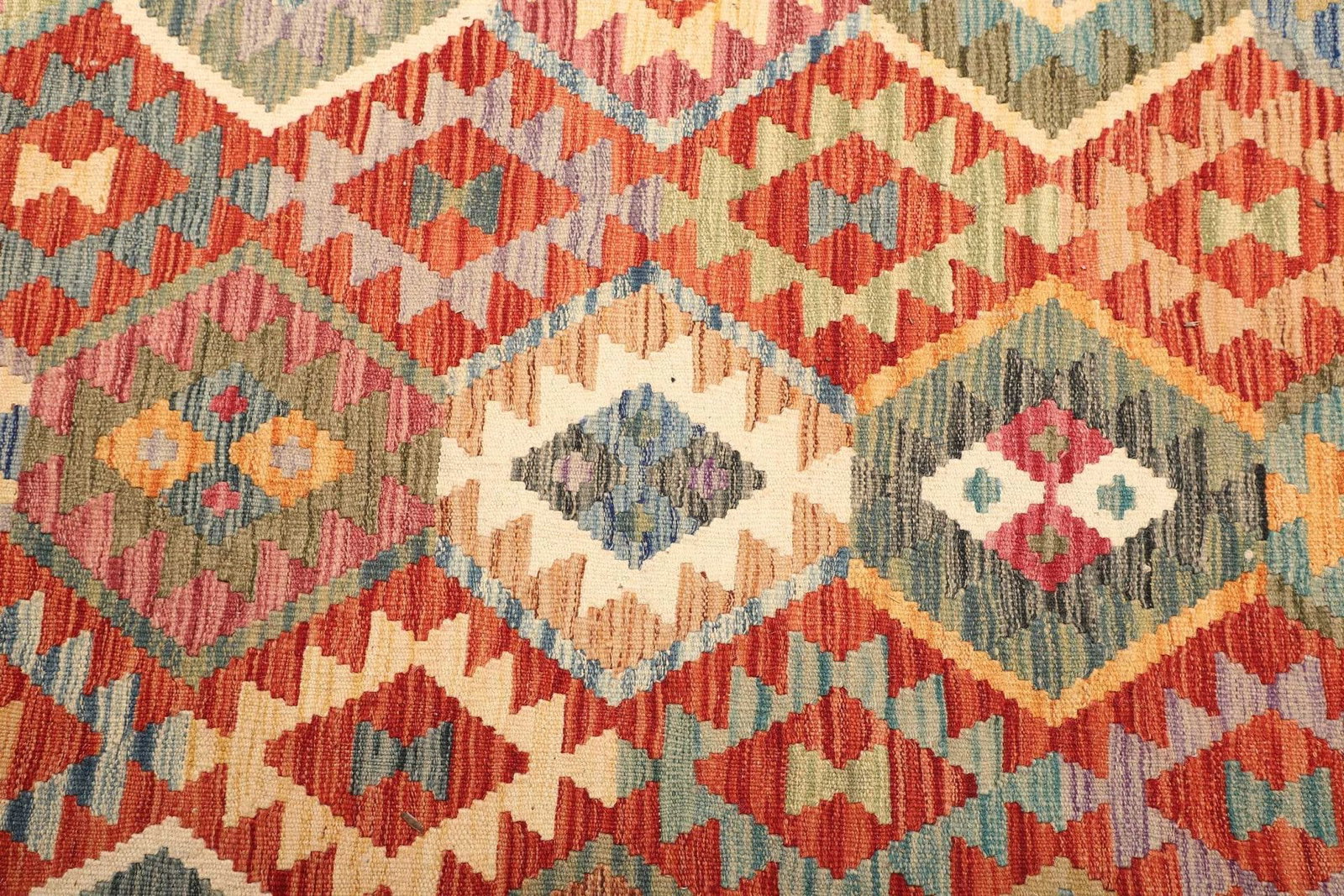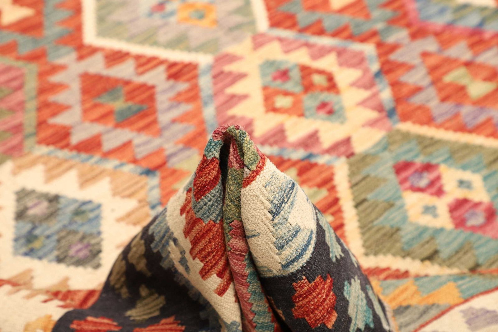 Um die Langlebigkeit Ihres handgewebten Kelim Teppichs zu gewährleisten, sollten Sie regelmäßig Staub absaugen und bei Bedarf mit einem feuchten Tuch reinigen. Vermeiden Sie starke chemische Reinigungsmittel, da diese die Wolle beschädigen können.