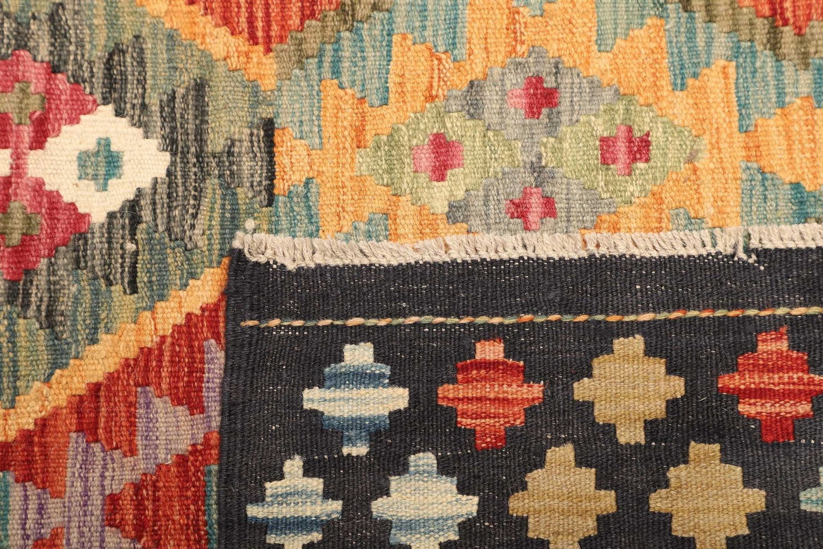 578$ In den WarenkorbKelim 215 x 144 cm – Handgewebt mit identischem Muster auf Vorder- und Rückseite – Orientteppich
