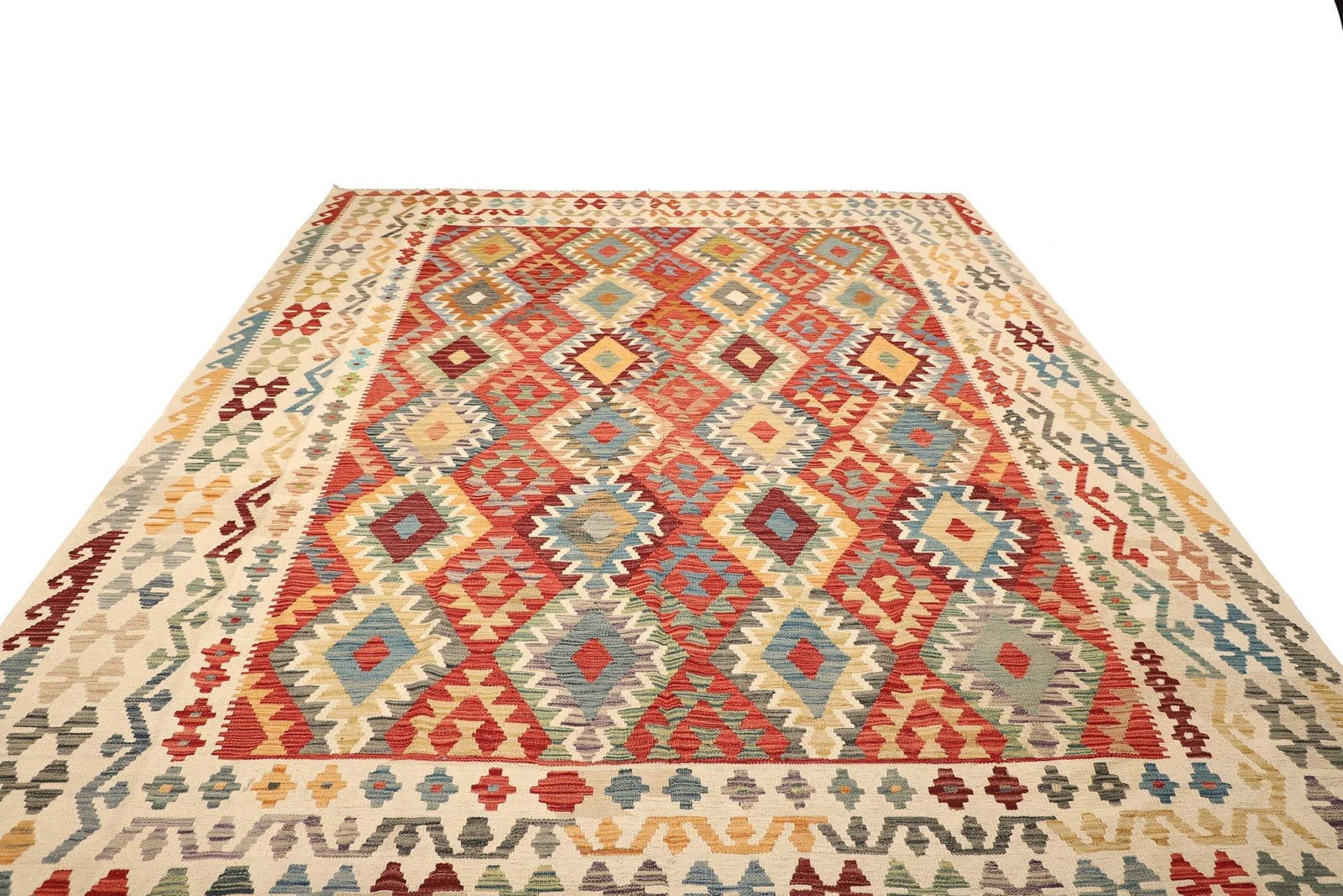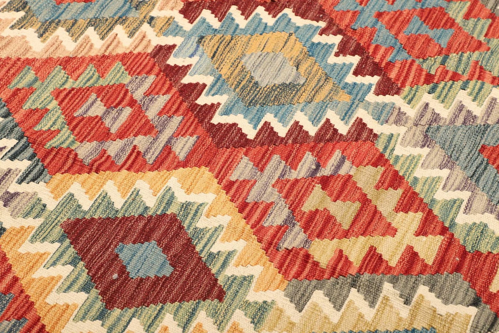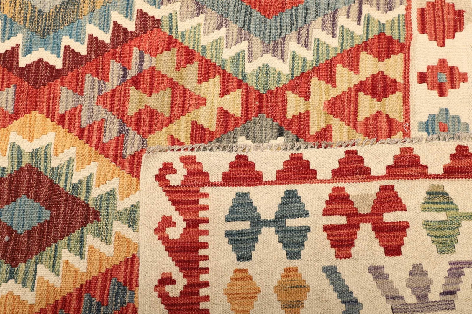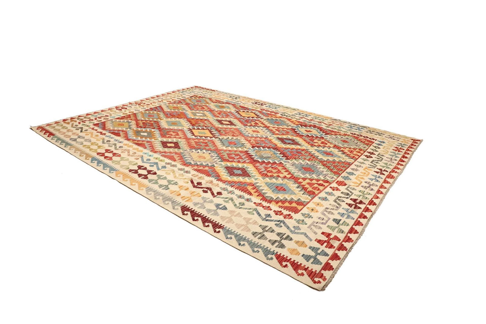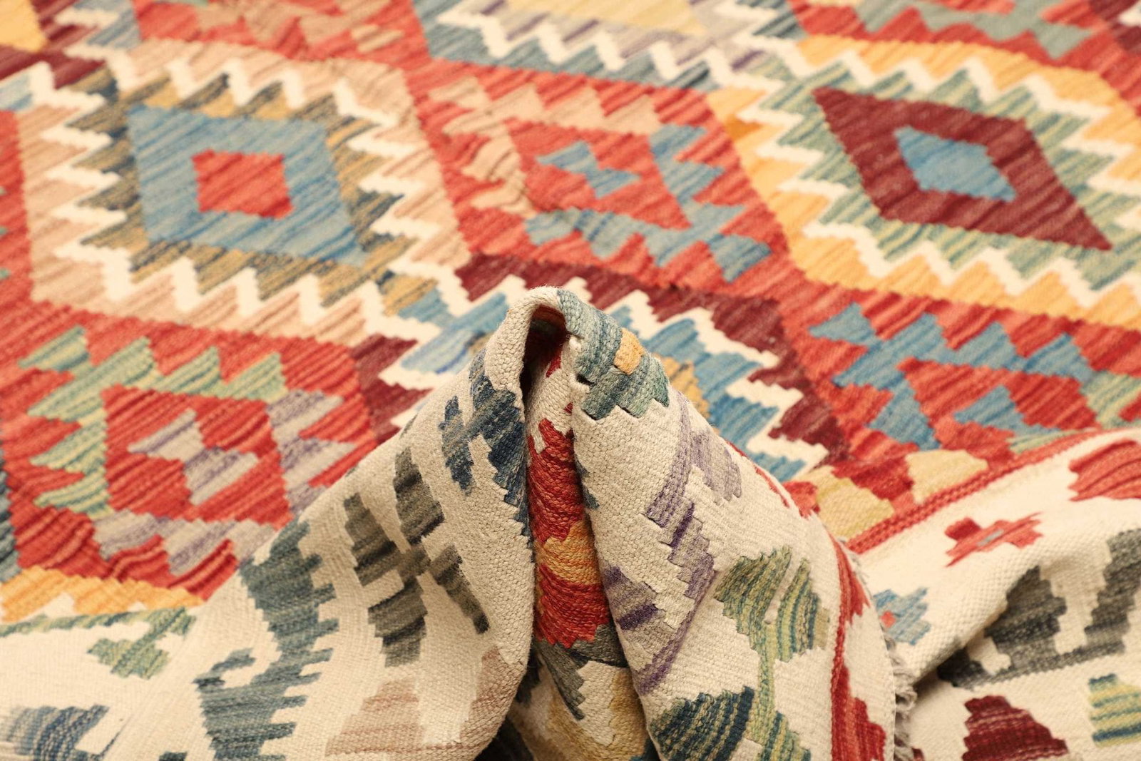 Dieser handgewebte Kelim Teppich bietet nicht nur außergewöhnliche Designmerkmale, sondern er ist auch pflegeleicht und strapazierfähig. Schurwolle ist von Natur aus schmutzabweisend und antiallergen, was ihn ideal für Haushalte mit Kindern oder Allergikern macht.