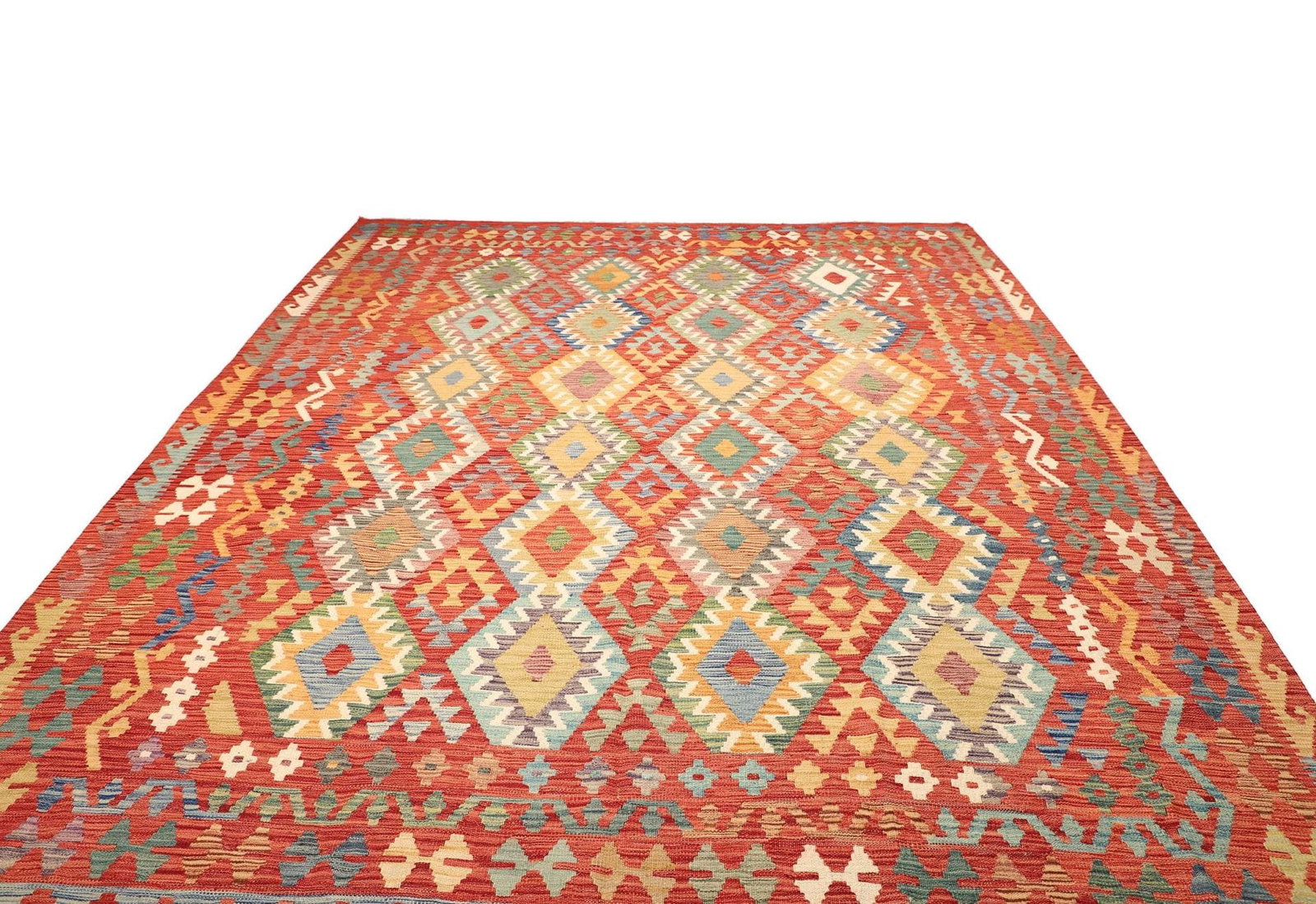 1526$Ursprünglicher Preis war: 1526$1350$Aktueller Preis ist: 1350$Kelim Teppich | Knotendichte: 200.000 Knoten/m² | Material: 100% Schurwolle | Größe: 273×346 cm | Herkunft: Pakistan | Zustand: Handgewebte Qualität | Florhöhe: ca. 5 mm | Kette: 100% Baumwolle