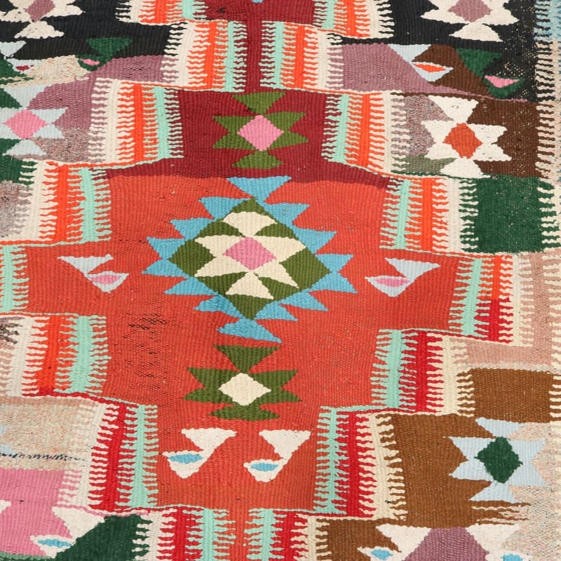 Die hochwertigen Materialien, aus denen dieser Kelim Teppich gefertigt ist, tragen zur Langlebigkeit und Stabilität bei. Typischerweise werden naturbelassene Wollen für die Webung verwendet, die nicht nur einen angenehmen Griff, sondern auch eine hervorragende Widerstandsfähigkeit bieten. Der Teppich ist handgewebt, was bedeutet, dass er von erfahrenen Kunsthandwerkern mit viel Liebe zum Detail und Fachkenntnis gefertigt wurde. Diese Technik verleiht dem Teppich nicht nur seine individuelle Note, sondern sorgt auch dafür, dass jedes Stück ein Unikat ist. Die sorgfältige Verarbeitung und die hohe Knotendichte machen diesen Orientteppich zu einem zeitlosen Möbelstück, das sowohl in modernen als auch in traditionellen Einrichtungsstilen zu finden ist.