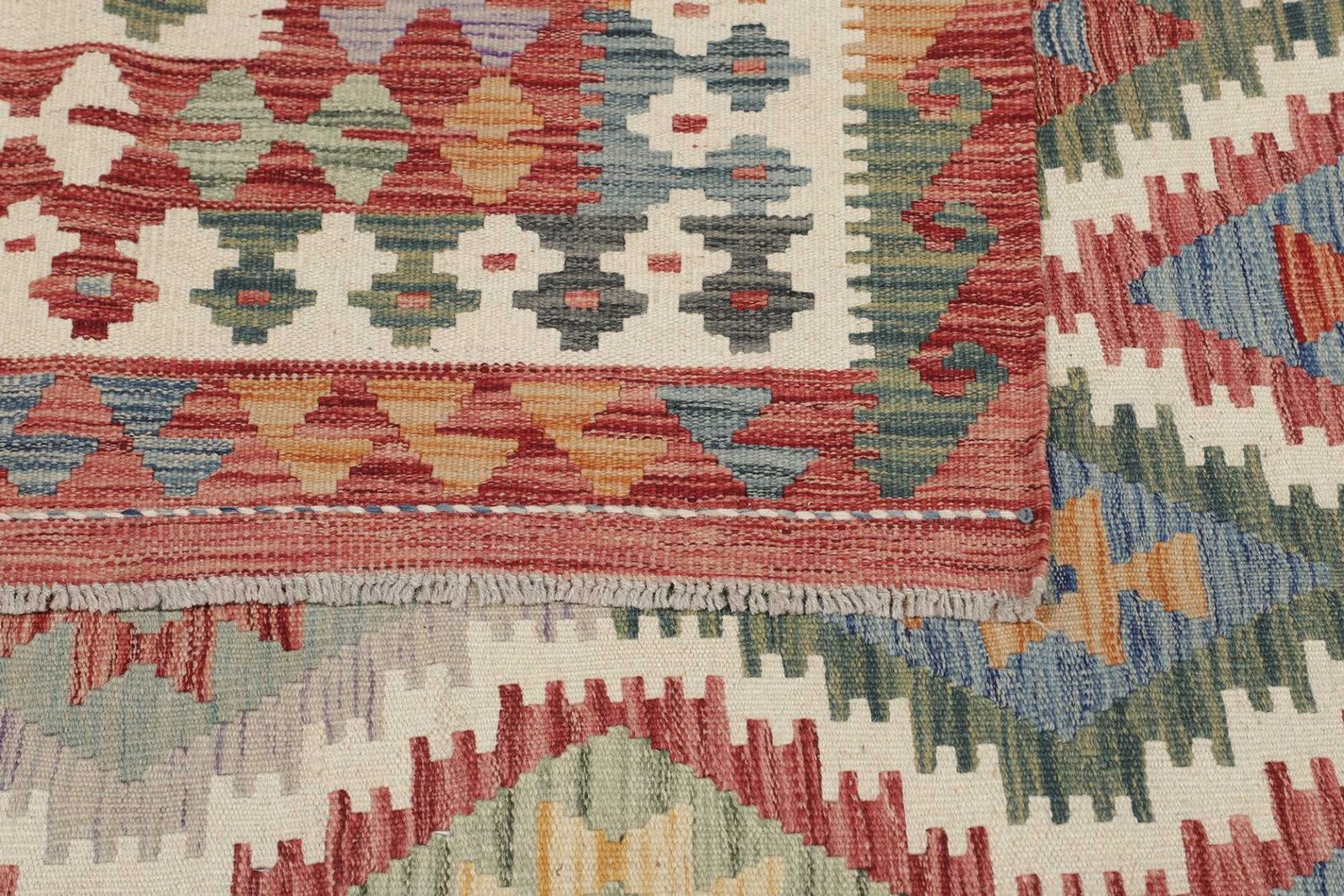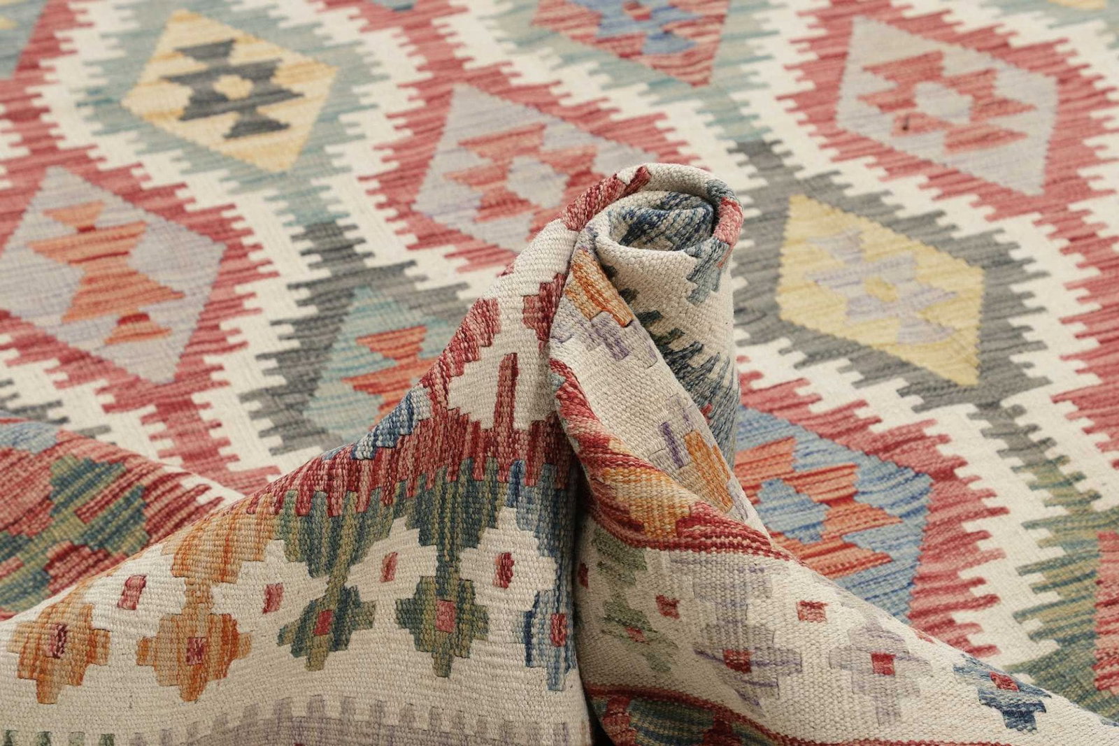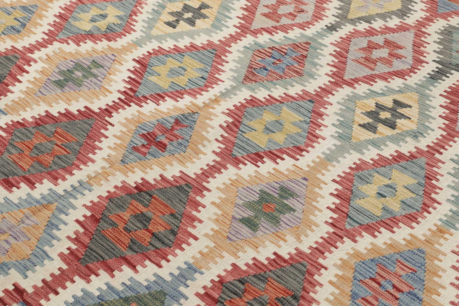 Die Knotendichte ist bei handgewebten Teppichen typischerweise anders als bei handgeknüpften Teppichen. Bei diesem Kelim ist die Produktionstechnik so gestaltet, dass eine robuste Struktur entsteht, die nicht nur optisch ansprechend ist, sondern auch zusätzlichen Komfort und Wärme bietet.