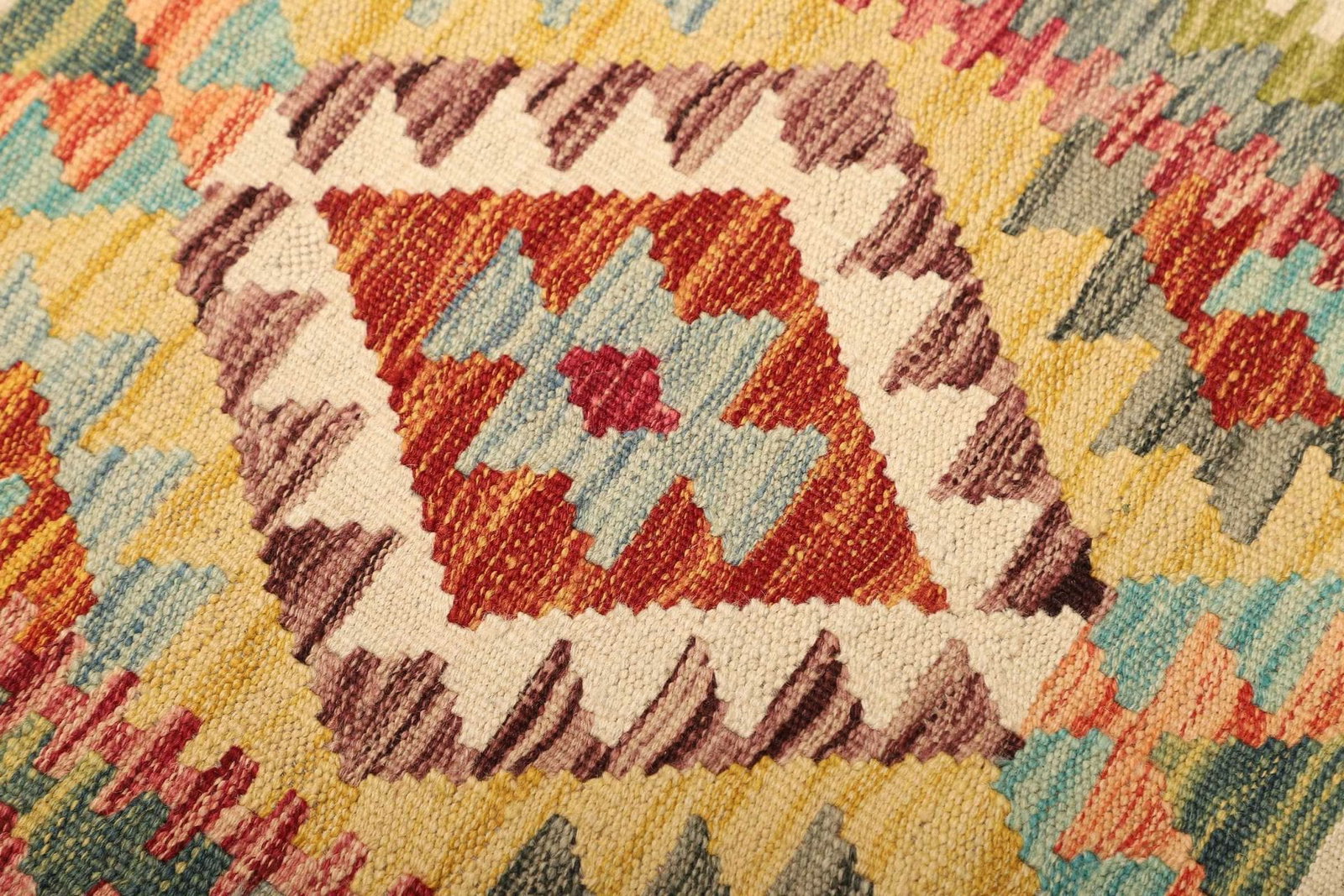 Die Knotendichte dieses handgewebten Teppichs ist sorgfältig ausgewogen, was ihm nicht nur Stabilität verleiht, sondern auch die Detailtreue seiner Muster unterstreicht. Jeder Teppich erzählt eine eigene Geschichte, die durch seine Herstellungstechnik und die Wahl der Farben und Muster geprägt wird. Der Kelim Teppich ist besonders pflegeleicht und eignet sich hervorragend für Räume mit hoher Fußgängerfrequenz, da die Wolle von Natur aus schmutzabweisend ist.