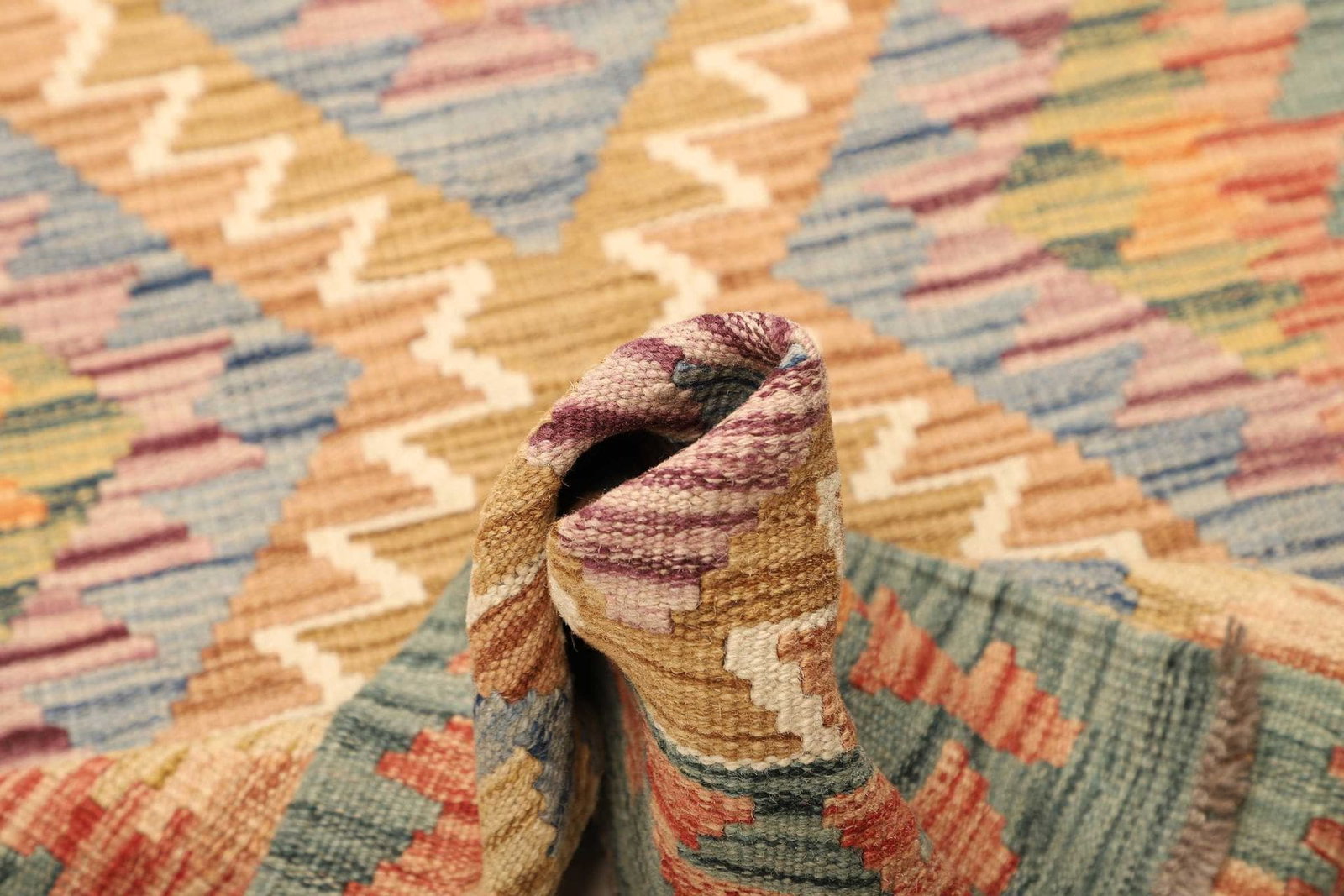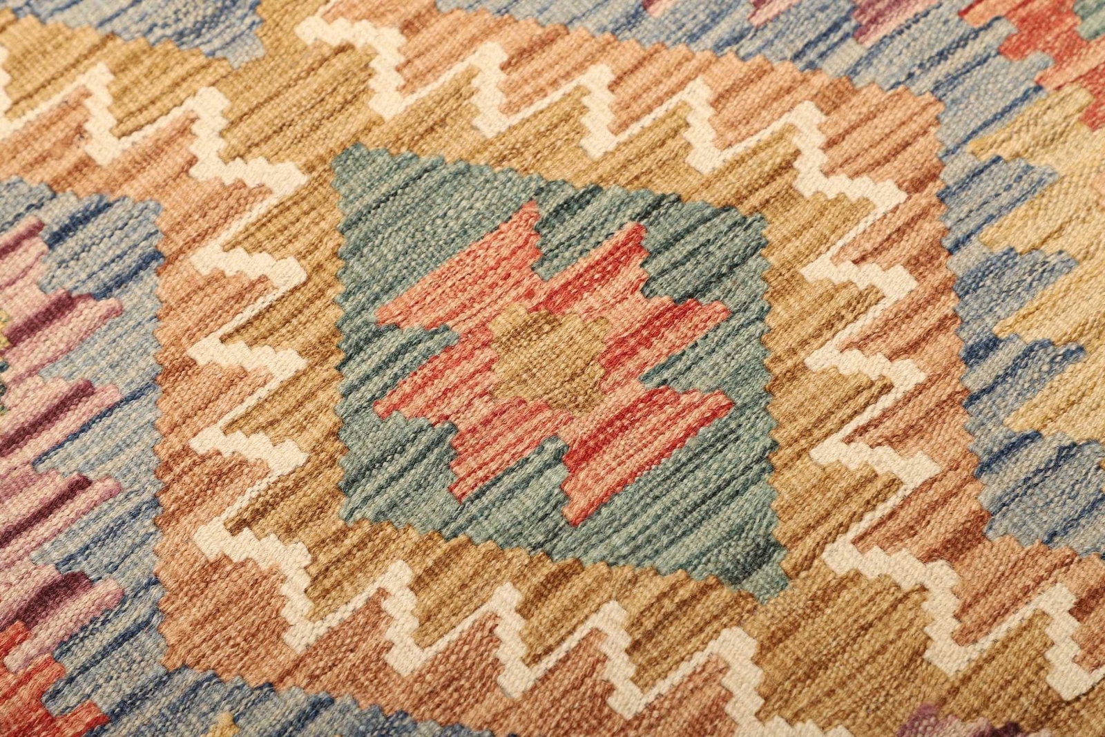 Dieser Kelim Teppich besticht durch eine ansprechende Kombination aus geometrischen Mustern und lebendigen Farben, die harmonisch aufeinander abgestimmt sind. Geometrische Motive sind typisch für Kelim-Teppiche und symbolisieren oft elementare Dinge des Lebens, wie Wasser, Erde und die Verbindung zur Natur. Die Farben sind in der Regel durch natürliche Farbstoffe gewonnen, was jedem Teppich einen einzigartigen Charakter verleiht und ihn zu einem Blickfang in jedem Raum macht. Die bunte Palette vereinfacht die Integration in verschiedene Wohnstile, von bohemian bis modern.