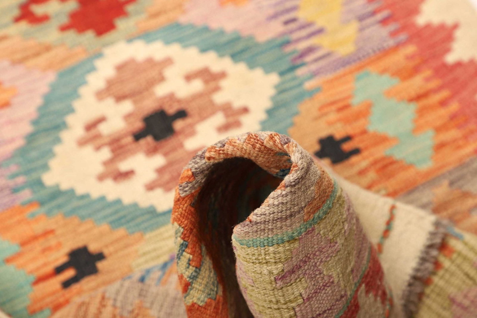 Ein wichtiger Aspekt eines Kelim Teppichs ist seine Wendbarkeit. Da die Teppiche sowohl auf Vorder- als auch Rückseite ein ansprechendes Design aufweisen, können sie einfach gedreht werden, wenn eine Seite abgenutzt ist. Dies verlängert nicht nur die Lebensdauer erheblich, sondern bietet Ihnen auch die Möglichkeit, Ihrem Raum einen frischen Look zu verleihen. Zudem ist Schurwolle von Natur aus schmutzabweisend und antistatisch, was die Pflege erleichtert.