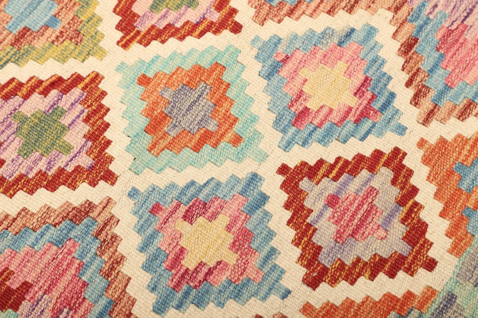 Dieser Kelim Teppich ist ein typisches Beispiel für die traditionelle Teppichkunst des Orients. Orientteppiche haben eine Vielzahl von Designs und Stilen, die tief in der Kultur und Geschichte ihrer jeweiligen Herkunftsregion verwurzelt sind. Die Verwendung von lebendigen Farben und geometrischen Mustern ist charakteristisch für diese Kunstform und erzählt Geschichten von alten Zivilisationen und Handwerkstraditionen. Die Teppichproduktion im Orient blickt auf eine jahrhundertealte Geschichte zurück, die bis in die Antike reicht.