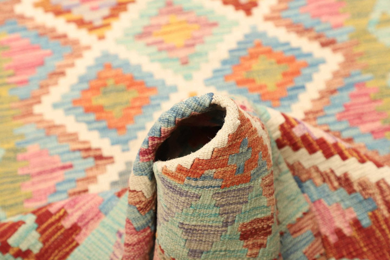 Einer der herausragenden Aspekte dieses handgewebten Kelim Teppichs ist seine Vielseitigkeit. Er fügt sich harmonisch in verschiedene Einrichtungsstile ein, sei es modern, skandinavisch oder rustikal. Dank der Schurwolle ist der Teppich auch für Allergiker geeignet und bietet eine optimale Wärmeisolierung, die in den kälteren Jahreszeiten von Vorteil ist. Darüber hinaus ist der Teppich pflegeleicht und kann einfach mit einem Staubsauger gereinigt werden.