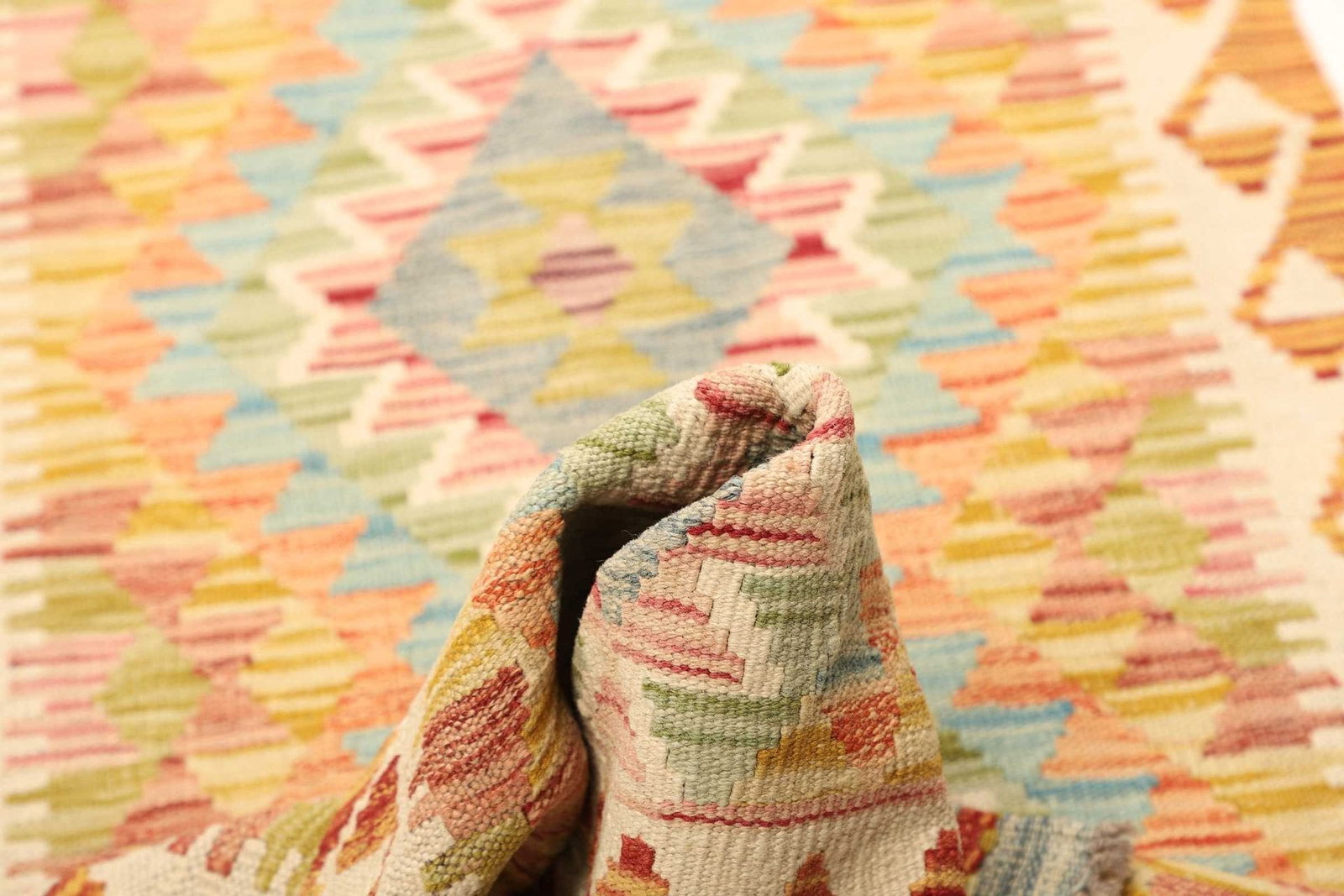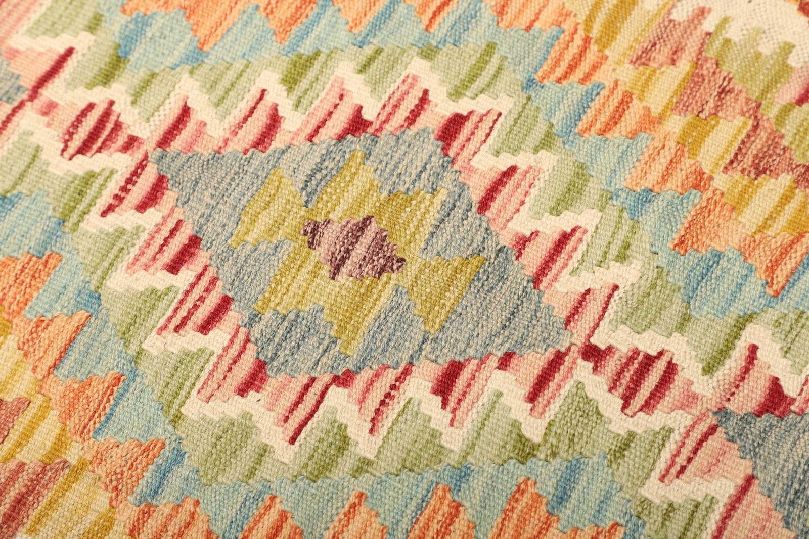 Ein herausragendes Merkmal des handgewebten Kelim Teppichs ist die Knotendichte. Im Vergleich zu anderen Teppichen, die oft sehr dicht geknüpft sind, sind Kelim Teppiche weniger dick und bieten eine Vielzahl von Anwendungsmöglichkeiten. Sie sind ideal für Räume, die eine gewisse Leichtigkeit und Eleganz ausstrahlen sollen. Ob im Wohnzimmer, im Schlafzimmer oder im Flur, dieser Teppich bringt Struktur und Farbe in Ihr Zuhause.