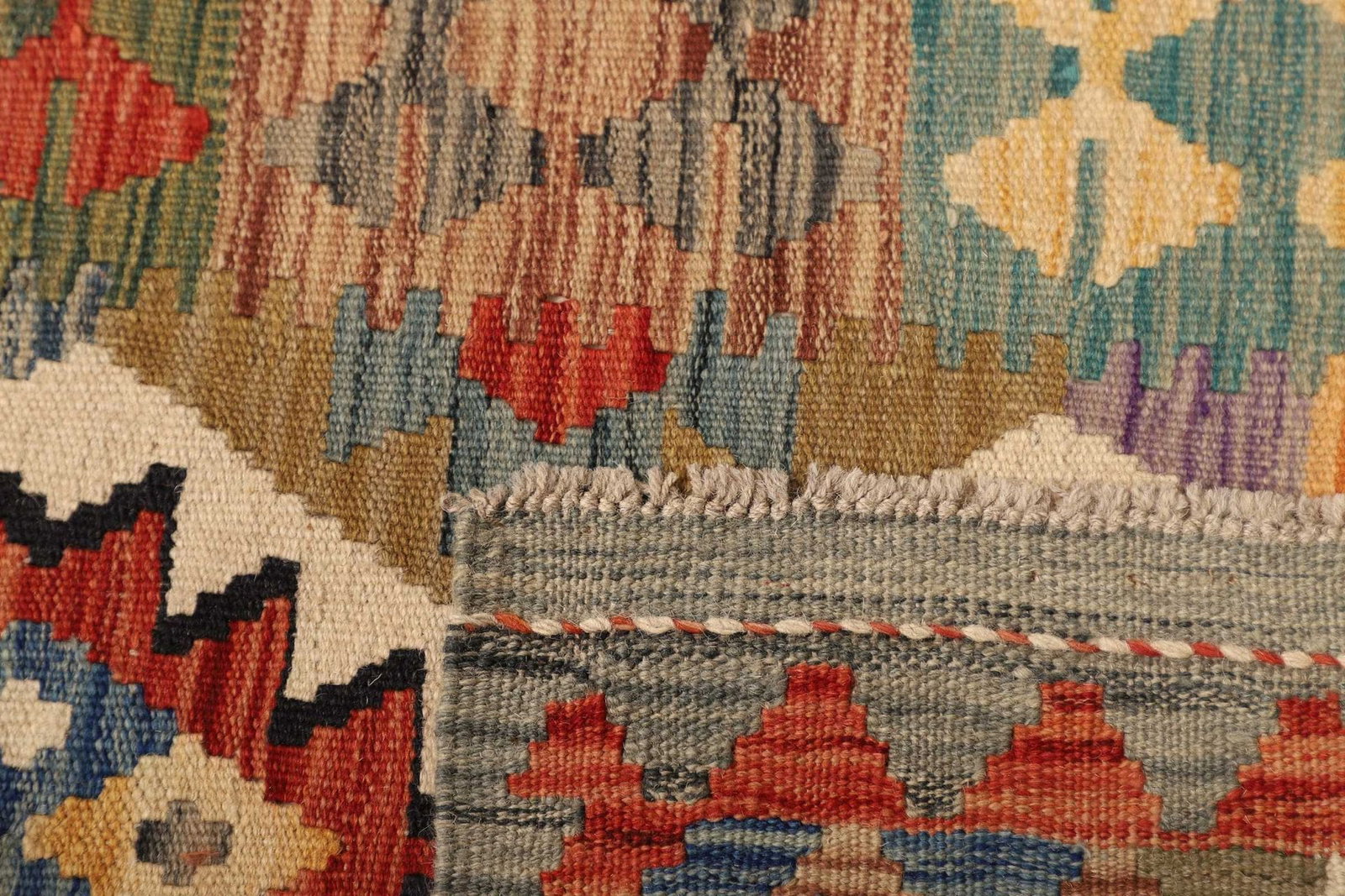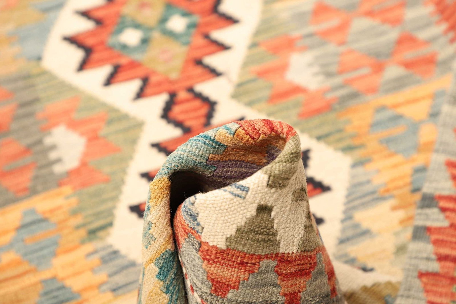 Der Kelim Teppich ist aus 100% reiner Wolle gefertigt. Wolle ist ein hervorragendes Material für Teppiche, da sie von Natur aus schmutzabweisend und strapazierfähig ist. Diese Eigenschaften sorgen dafür, dass der Teppich trotz täglicher Abnutzung seine Form und seine Farbintensität lange behält. Die handgewebte Technik, die bei der Herstellung verwendet wird, garantiert eine hohe Knotendichte und eine detailgenaue Verarbeitung. Dies macht jeden Teppich zu einem einzigartigen Kunstwerk, das die Fertigungstraditionen vergangener Generationen widerspiegelt.