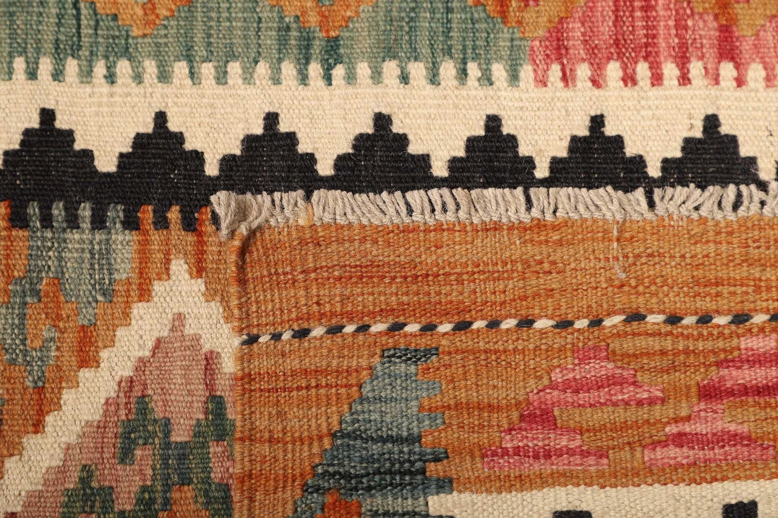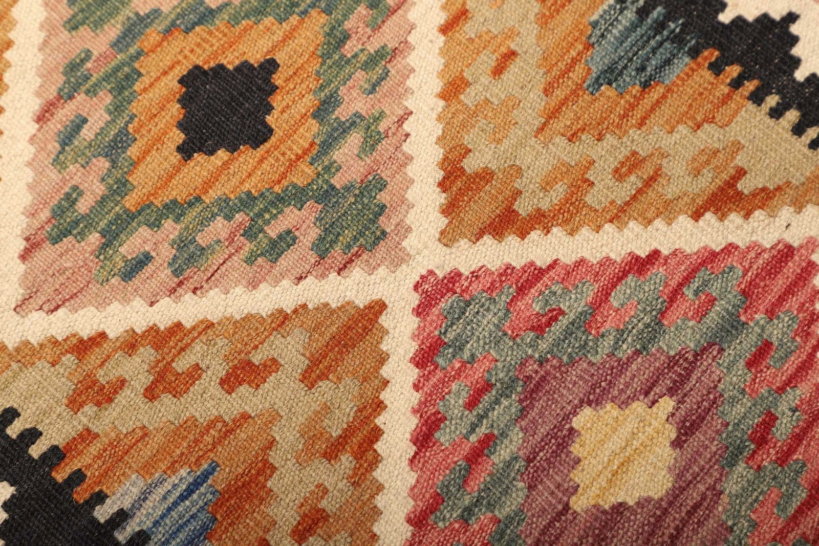Die Verwendung von Wolle als Hauptmaterial verleiht diesem Teppich seine ursprüngliche, natürliche Textur. Wolle ist nicht nur von Natur aus schmutzabweisend, sondern sorgt auch für eine hervorragende Isolierung. Bei der Handwebtechnik entsteht eine hohe Knotendichte, die eine detailreiche Oberfläche schafft. Aufgrund der einzigartigen Verarbeitungstechnik sind die Farben dieses Kelims lebendig und strahlen in ihrer Natürlichkeit, was dem Raum eine warme und einladende Atmosphäre verleiht.