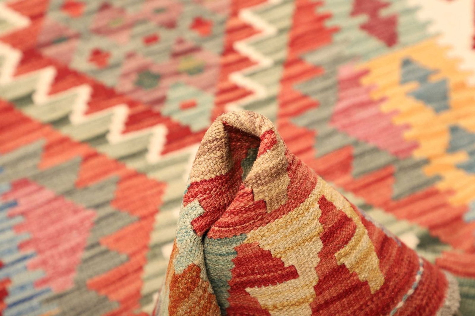 Unser Kelim Teppich besteht ausschließlich aus feiner Wolle, die für ihre Langlebigkeit und ihren Komfort bekannt ist. Wolle hat die Fähigkeit, Wärme zu speichern und gleichzeitig für eine gute Luftzirkulation zu sorgen, was sie zum idealen Material für Teppiche macht. Durch den prozess der handgewebten Technik erhält jeder Teppich seine individuelle Note. Diese traditionelle Handwebtechnik gewährleistet nicht nur außergewöhnliche Qualität, sondern auch eine einzigartige Textur, die mit jedem Schritt spürbar wird. Die Verwendung von Wolle sorgt darüber hinaus für natürliche Schmutzabweisung und eine einfache Pflege.