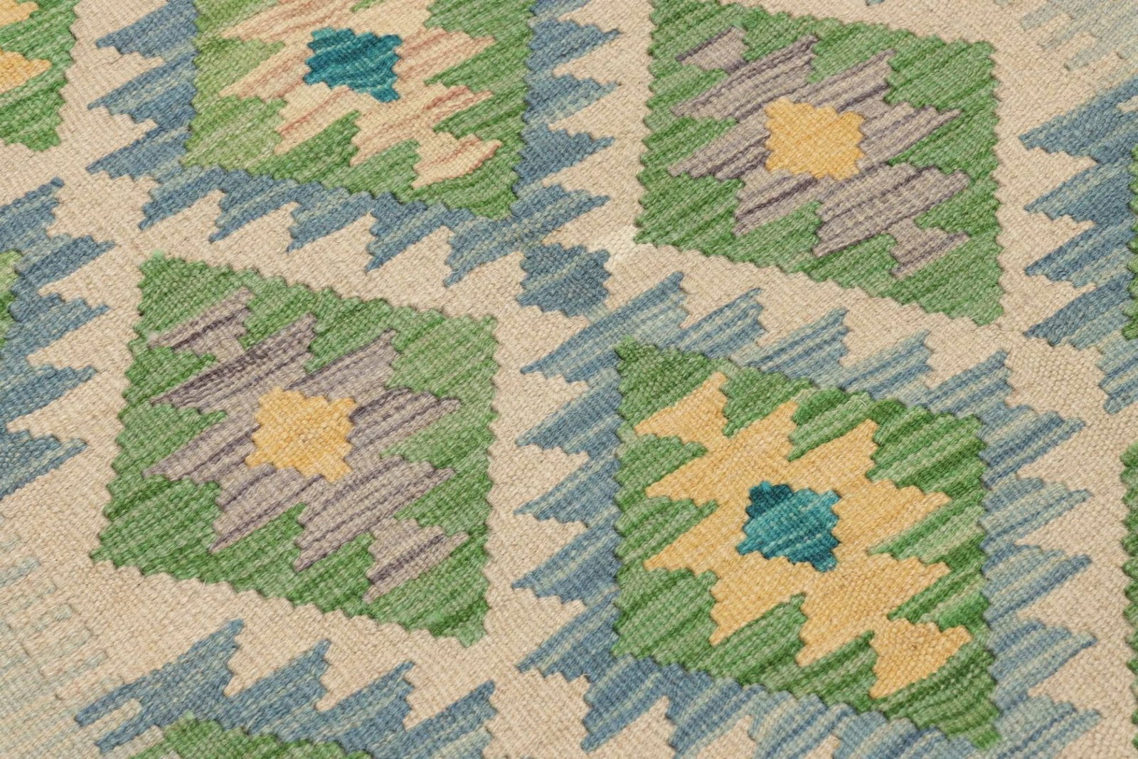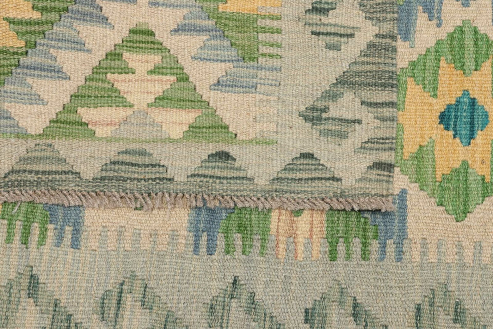 Der Kelim Teppich besteht aus 100% Schurwolle, einem natürlichen Material, das für seine hervorragenden Eigenschaften geschätzt wird. Wolle ist nicht nur nachhaltig und umweltfreundlich, sondern bietet auch eine hervorragende Isolierung gegen Kälte und Wärme. Der Teppich fühlt sich angenehm unter den Füßen an und sorgt für ein warmes und einladendes Raumgefühl. Durch die handgewebte Verarbeitung wird jeder Teppich zu einem Unikat, das die individuelle Handwerkskunst seines Erstellers widerspiegelt.