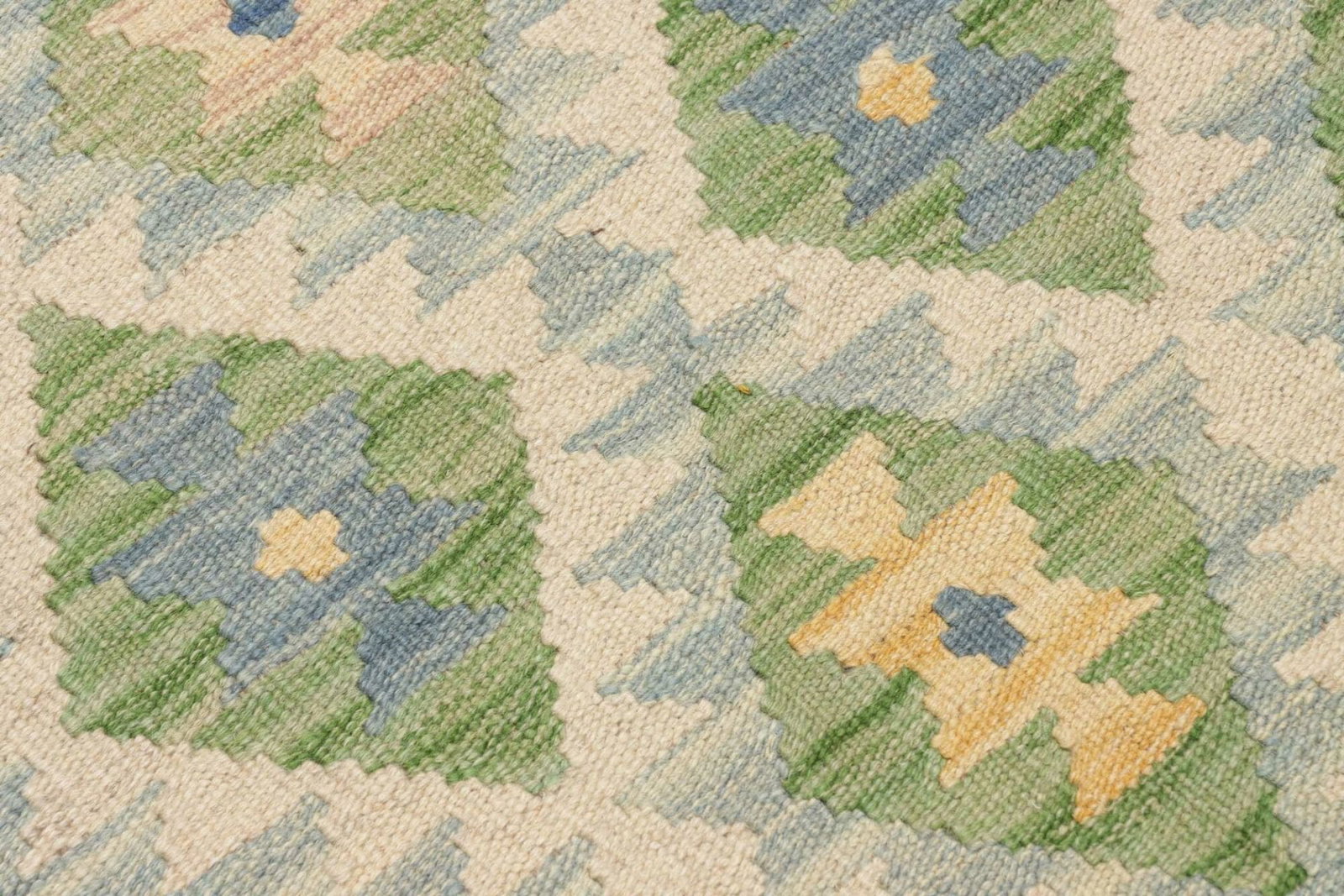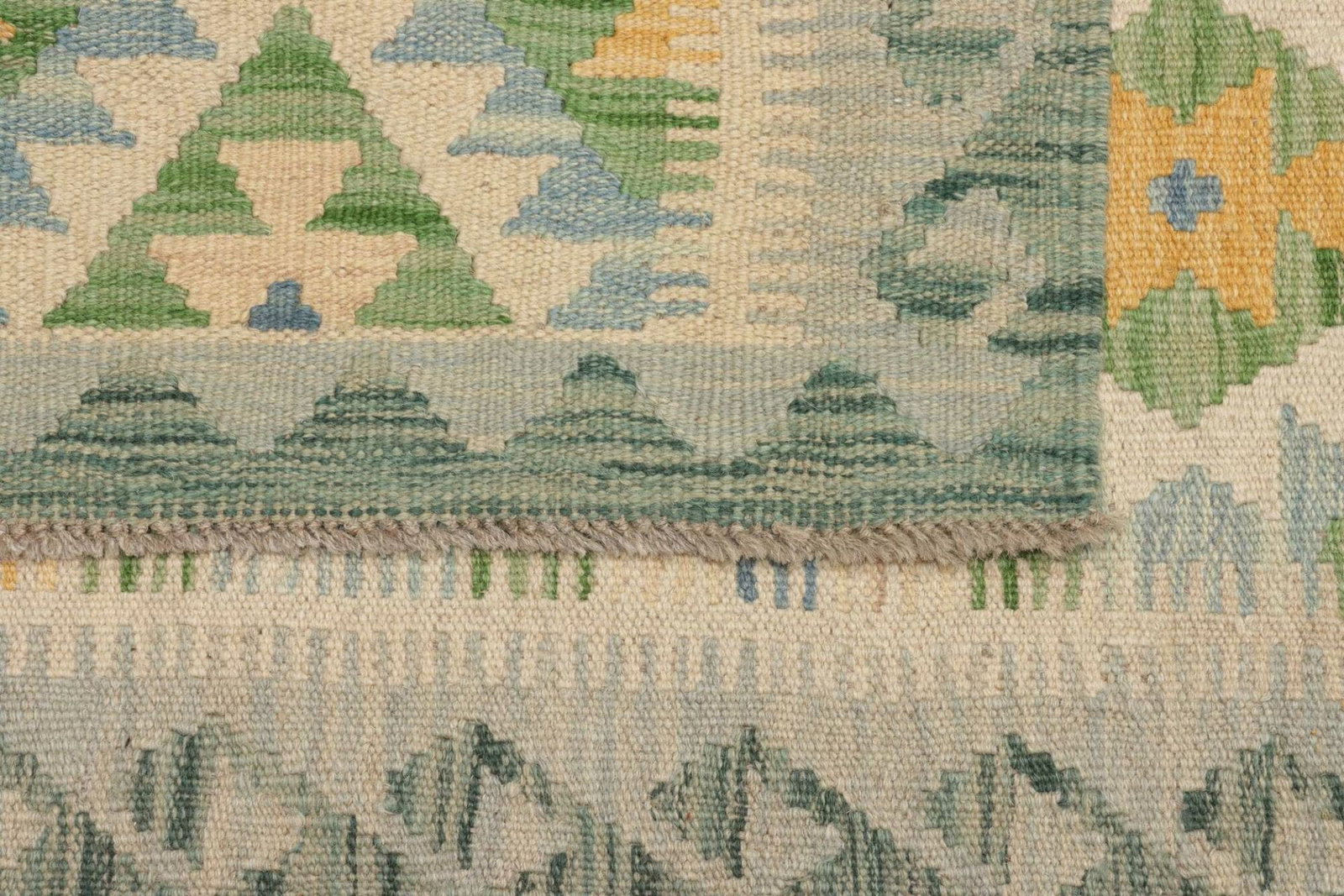 Bei der Herstellung dieses Kelim Teppichs spielt die Qualität der verwendeten Wolle eine entscheidende Rolle. Wolle ist nicht nur besonders weich im Griff, sondern hat auch schmutzabweisende Eigenschaften, die den Teppich pflegeleicht machen. Die handgewebte Technik des Kelim sorgt dafür, dass die Farben besonders strahlend und langlebig sind. Durch den Verzicht auf einen hohen Flor bleibt der Teppich auch bei intensivem Gebrauch in einem hervorragenden Zustand.