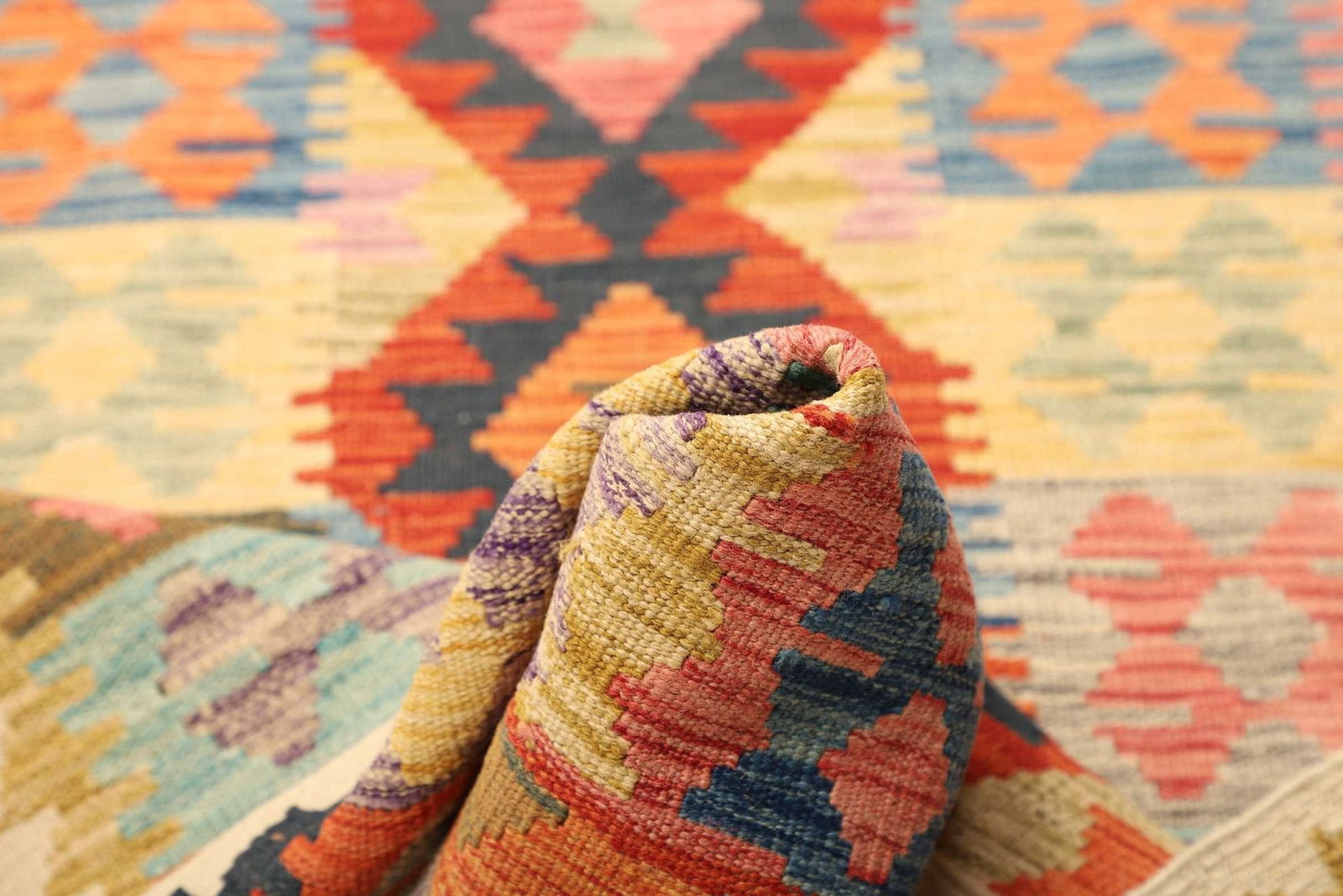 Der Kelim Teppich besteht aus 100 % reiner Wolle, die für ihre Strapazierfähigkeit und ihre schmutzabweisenden Eigenschaften bekannt ist. Wolle ist nicht nur ein nachhaltiges Material, sondern auch ideal für die Verwendung in Wohnräumen, da es hilft, die Temperatur zu regulieren und eine angenehme Atmosphäre zu schaffen. Die Verarbeitung des Teppichs in traditioneller handgewebter Technik garantiert, dass jeder Teppich ein Unikat ist – die Knotendichte und die Verarbeitungstechnik spiegeln die hohe Handwerkskunst wider, die mit jahrhundertealten Traditionen verbunden ist.