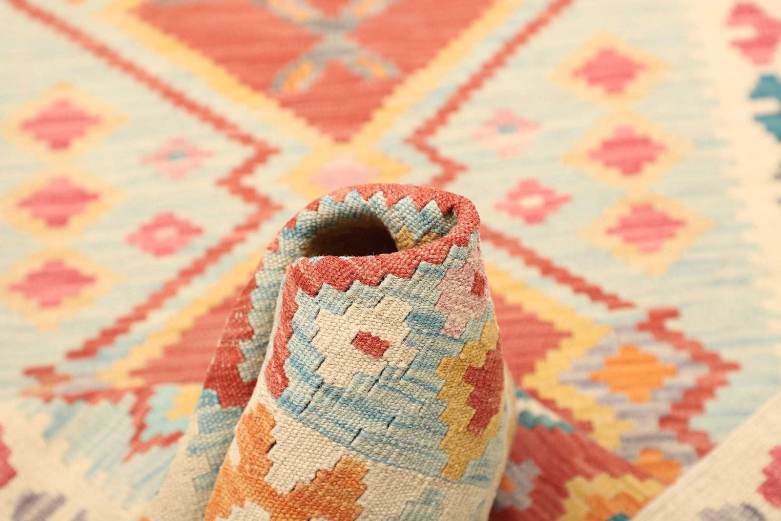 Dieser Kelim Teppich wird aus feiner Wolle handgewebt, was ihm eine besonders hohe Strapazierfähigkeit verleiht. Wolle ist nicht nur angenehm weich, sondern auch temperaturausgleichend, sodass der Teppich im Sommer kühl und im Winter warm wirkt. Die handgewebte Verarbeitung sorgt zudem dafür, dass jeder Teppich ein Unikat darstellt. Die traditionellen Webtechniken, die über Generationen weitergegeben wurden, garantieren nicht nur Qualität, sondern auch einzigartiges Design.