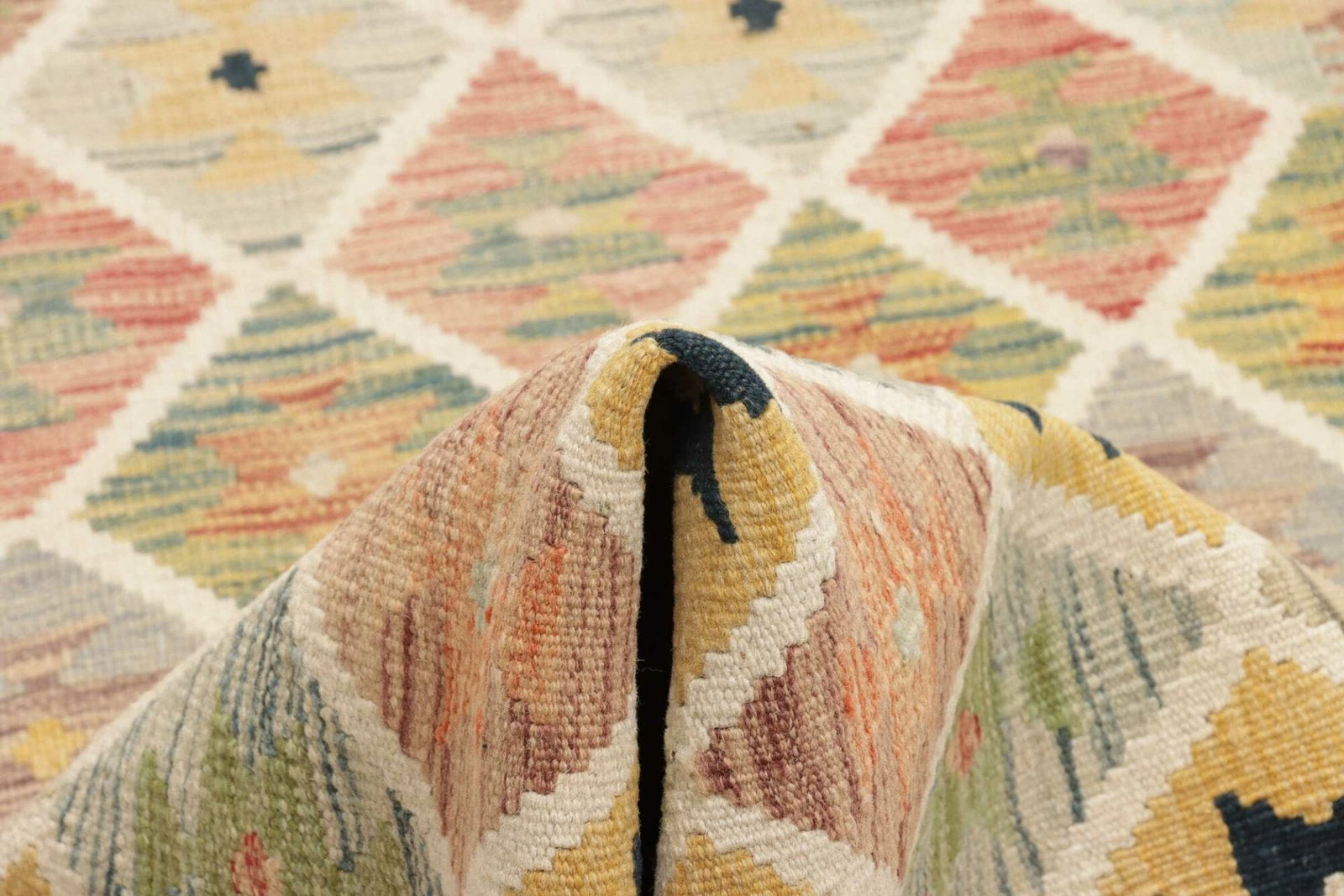 Der Kelim Teppich besteht aus hochwertiger, handgewebter Schurwolle, die für ihre hervorragenden Eigenschaften geschätzt wird. Schurwolle ist nicht nur umweltfreundlich, sondern bietet auch natürliche Isolationseigenschaften, die in kälteren Monaten für Wärme und Behaglichkeit sorgen. Gleichzeitig hat sie eine atmungsaktive Qualität, die für ein angenehmes Raumklima sorgt. Die Wahl dieses Materials ist eine nachhaltige Entscheidung und unterstützt gleichzeitig das traditionelle Handwerk.