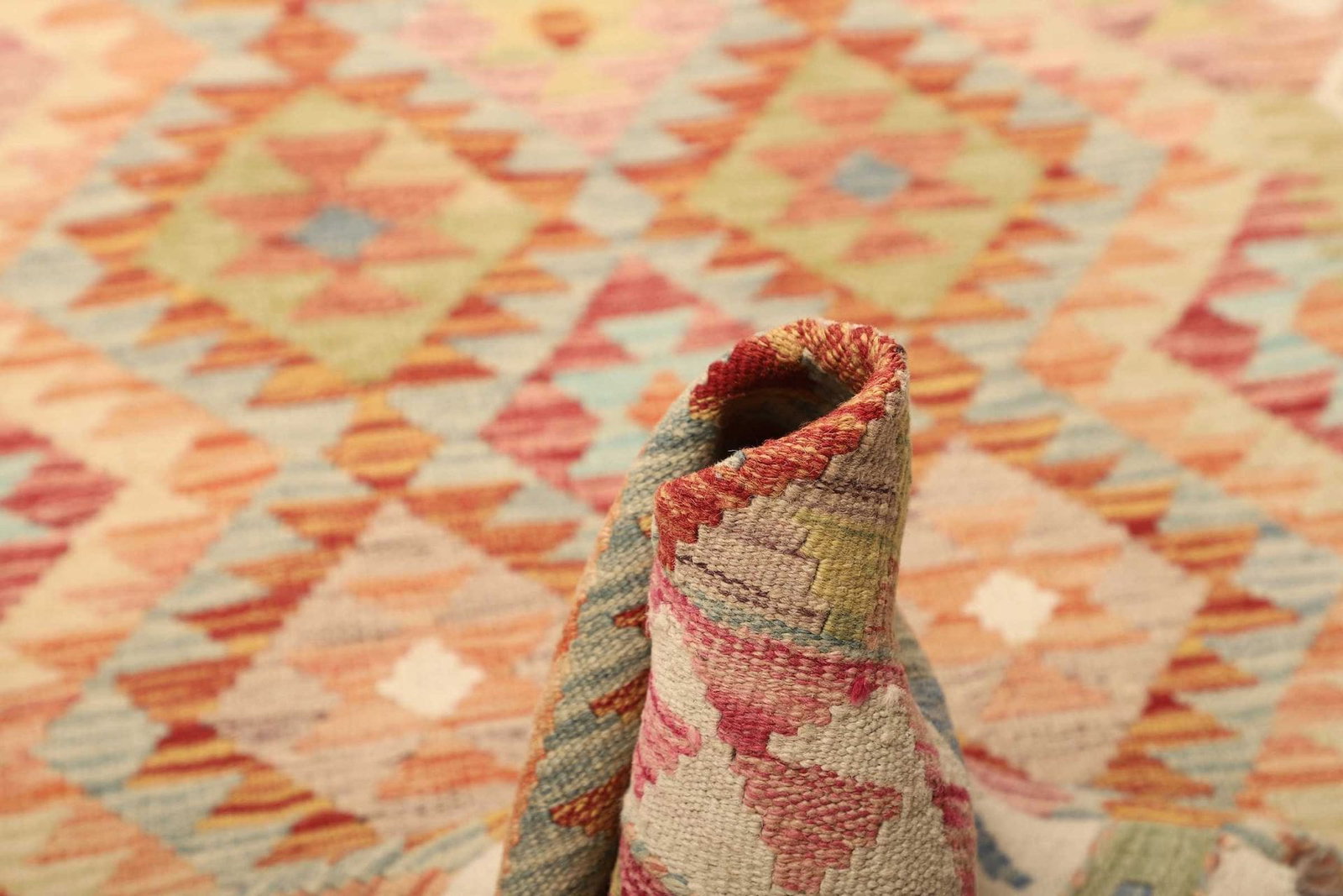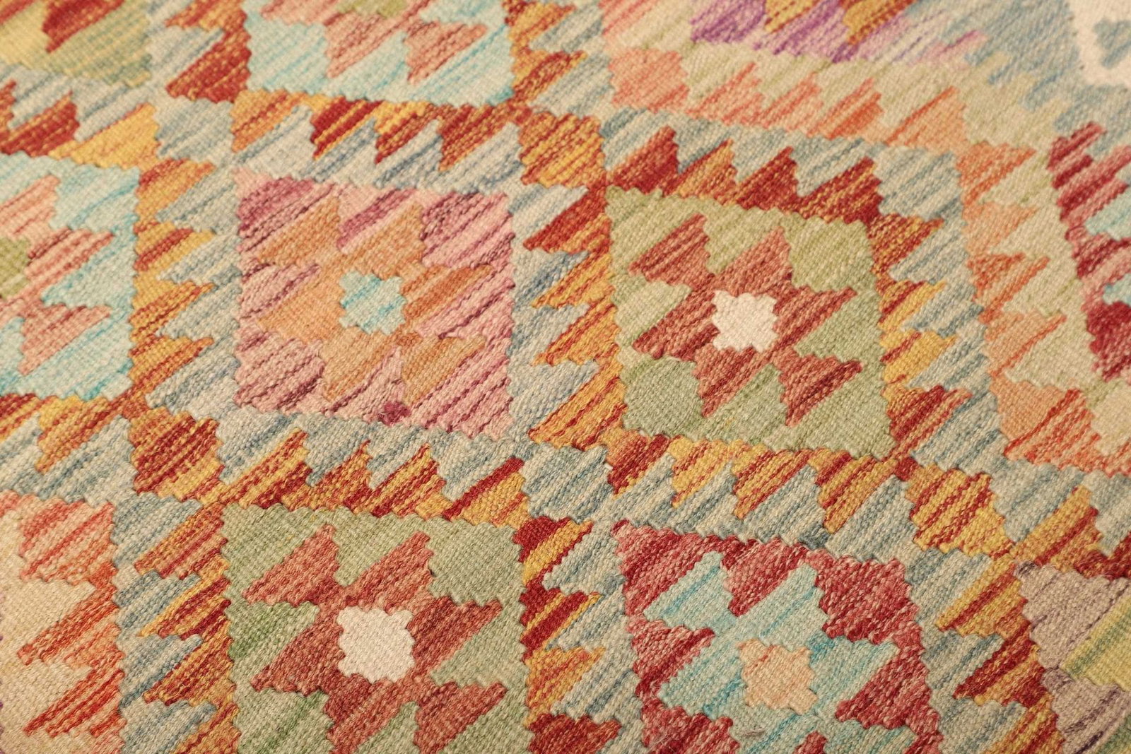Ein handgewebter Kelim Teppich ist besonders pflegeleicht. Die Wolle hat naturgegebene schmutzabweisende Eigenschaften, sodass Flecken einfach mit Wasser und einem milden Reinigungsmittel behandelt werden können. Dank der flachen Webart sind Kelims zudem leichter als ihre geknüpften Gegenstücke und lassen sich einfach bewegen und reinigen. Zudem ist das rustikale Flair des Teppichs vielseitig und passt hervorragend zu modernen und klassischen Einrichtungsstilen, ohne jemals aus der Mode zu kommen.